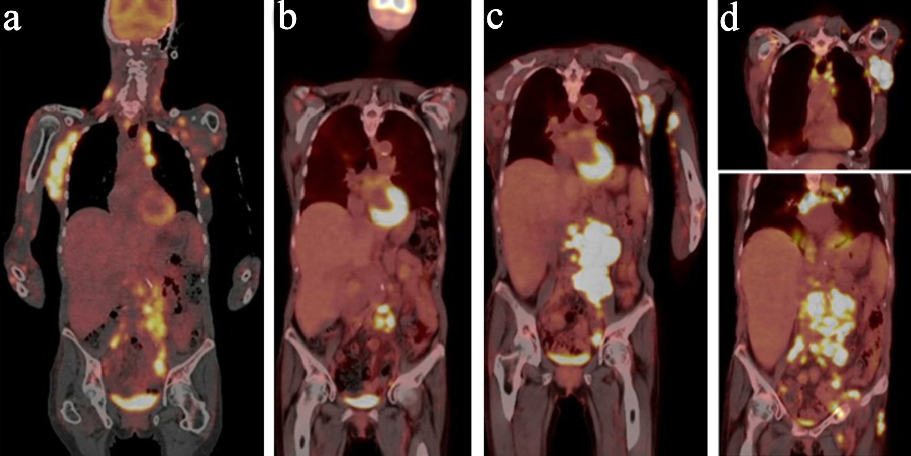 ![]() Click for large image | Figure 1. PET-CT panel with initial PET-CT, PET-CT with progression in February, 2019, PET-CT in May, 2019 and PET in July, 2019. (a) PET-CT at initial diagnosis. (b) PET-CT after brentuximab. (c) PET-CT with progression on brentuximab. (d) PET-CT with progression on mogamulizumab. PET-CT: positron emission tomography-computed tomography. |