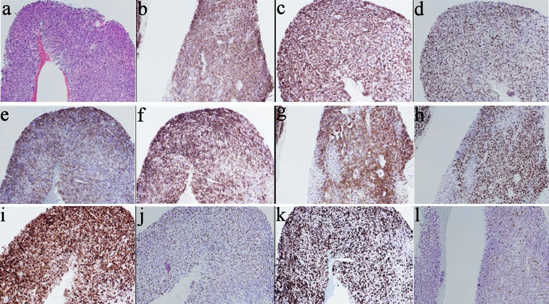 ![]() Click for large image | Figure 2. Pathology images/panel with EBV+ DLBCL. (a) H&E stain showing large lymphoma cells infiltrating the tissue in sheets (× 10). (b) CD20 IHC (× 10). (c) BCL2 IHC (× 10). (d) BCL6 IHC (× 10). (e) CD21 IHC (× 10). (f) CD23 IHC (× 10). (g) CD30 IHC (× 10). (h) OCT2 IHC (× 10). (i) MUM1 IHC (× 10). (j) Twenty to thirty percent of cells positive for MYC IHC (× 10). (k) High proliferation index (80-90%) by Ki-67 IHC (× 10). (l) Patchy positive EBER-ISH (× 10). EBV: Epstein-Barr virus; DLBCL: diffuse large B-cell lymphoma; H&E: hematoxylin and eosin stain; IHC: immunohistochemistry; ISH: in situ hybridization; CD: cluster of differentiation. |