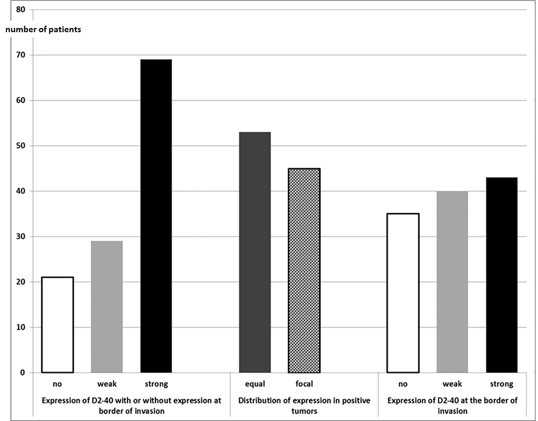 Table 2 shows the expression of D2-40 at the border of invasion in relation to the reaction in the remaining tumor cells. A correlation between both could not be found, so that there seem to be two divergent expression patterns which can occur simultaneously or separately. Regarding the accentuation of D2-40-positive cells at the border of invasion, we compared the staining intensity here with the staining intensity in the entire tumor. In positive cases, we found the same intensity in both places.