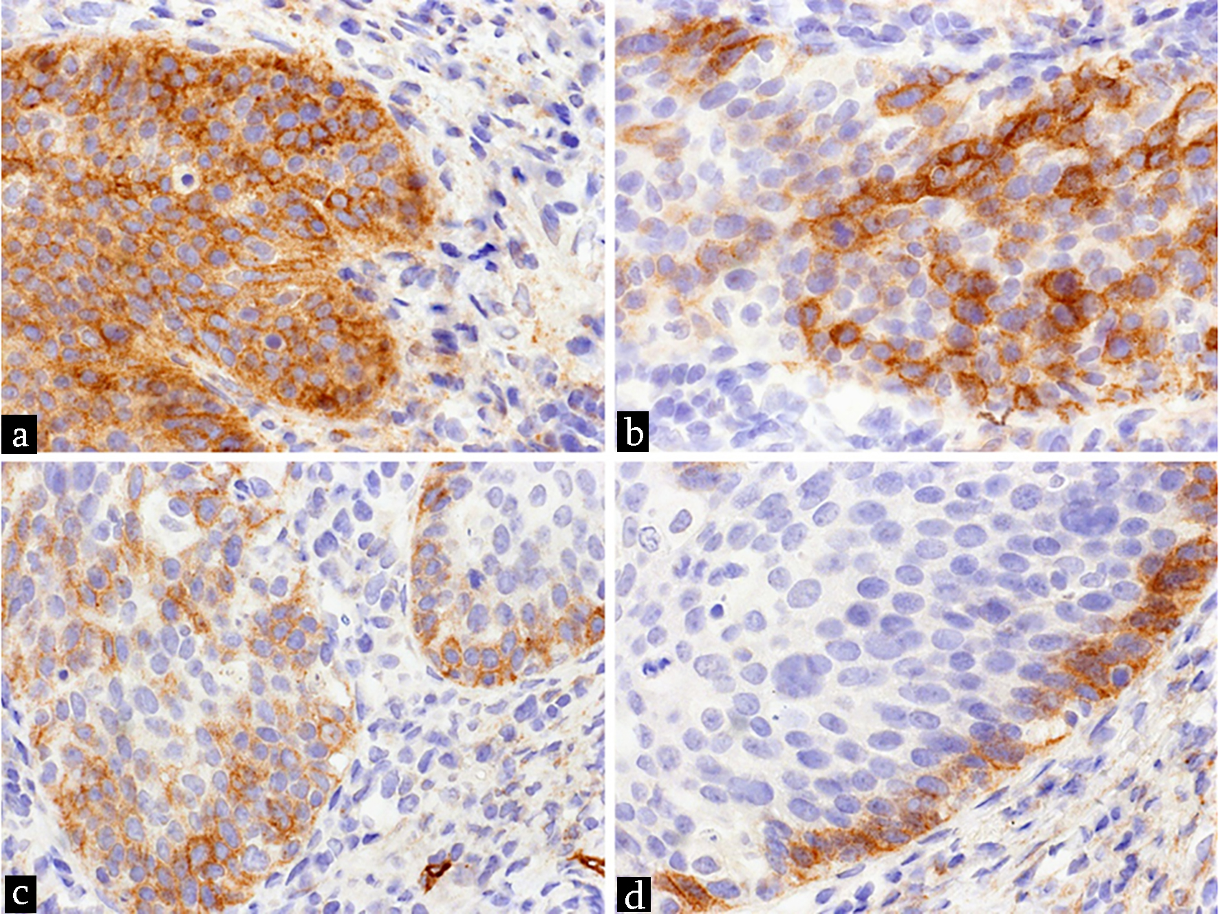 ![]() Click for large image | Figure 2. Examples for expression of D2-40 in tumor tissue of SCC. (a) Equally distribution of strong reaction (Funayama grade 3). (b) Focally distribution of strong reaction (Funayama grade 2). (c) Focally distribution of weak reaction. (d) Reaction at the border of invasion within a case with focally weak reaction (not shown in tumor cells nearby the border of invasion within this area) (magnification, × 200). SCC: squamous cell carcinoma. |
