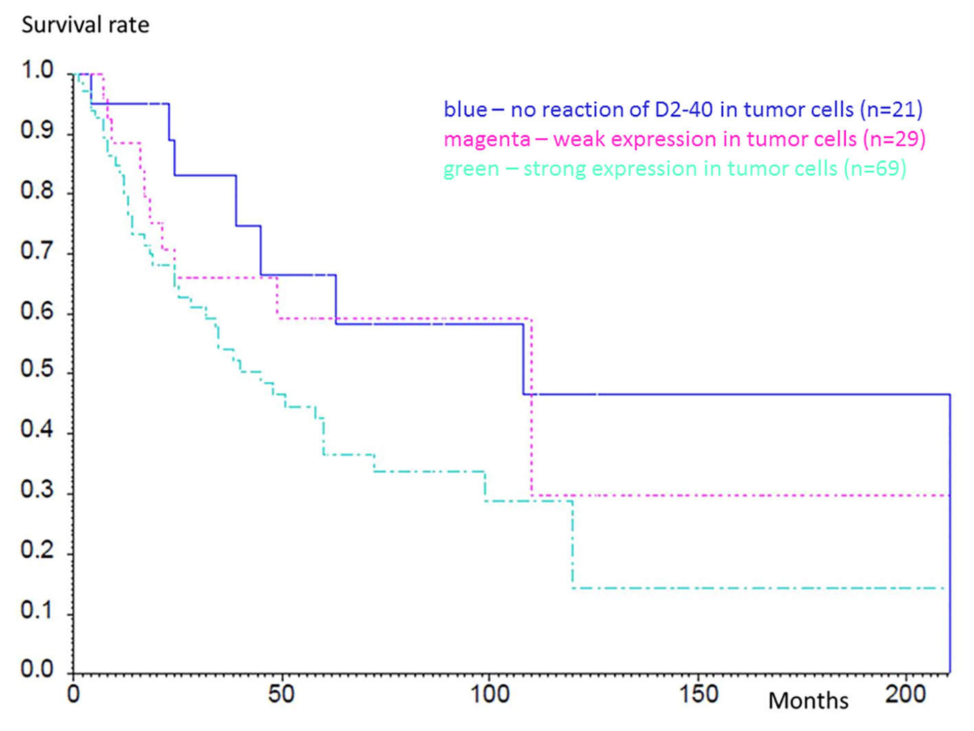 ![]() Click for large image | Figure 3. Kaplan-Meier analysis of survival rates within the groups with different expression of D2-40. Blue line shows no reaction of D2-40 in tumor cells (n = 21), magenta shows weak expression in tumor cells (n = 29) and green shows strong expression in tumor cells (n = 69). The differences were not significant. |