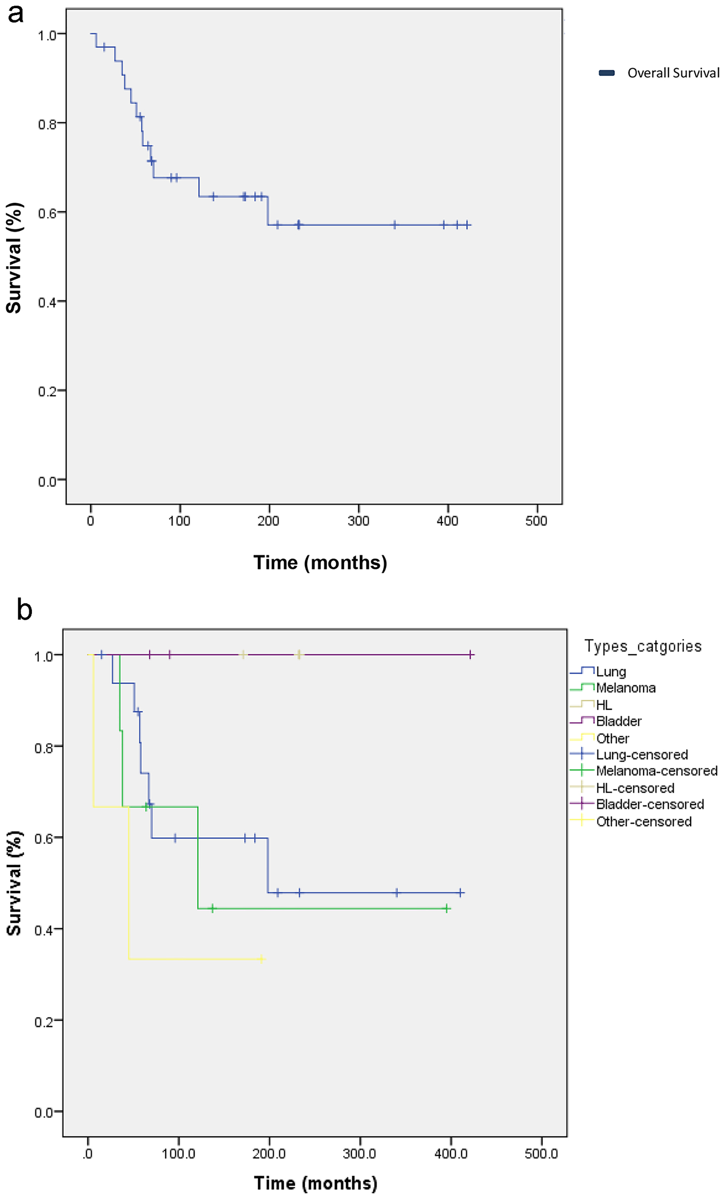 Discontinuation of treatment occurred in 14 patients, and treatment was interrupted in one patient’s case. Ten patients received treatment after immunotherapy. Nineteen patients are still alive and receiving treatment either with immunotherapy or chemotherapy, 15 patients have died and three were lost to follow-up and excluded from the study. Patients were recruited in the period extending from January 1, 2014 to January 12, 2016. Patients were followed up until either death or discontinuation of treatment. Median follow-up time for patients since the date of diagnosis was 23 months. The median OS in all patients was 272.99 days (95.0% confidence interval: 207.54 - 338.45) (Fig. 2a). The median OS by type of cancer were 198, 121 and 45 months for patients with lung, melanoma and other, respectively. None of the patients who had Hodgkin’s lymphoma or bladder cancer passed away, therefore mean and median survival for these patients was not computed (Fig. 2b).