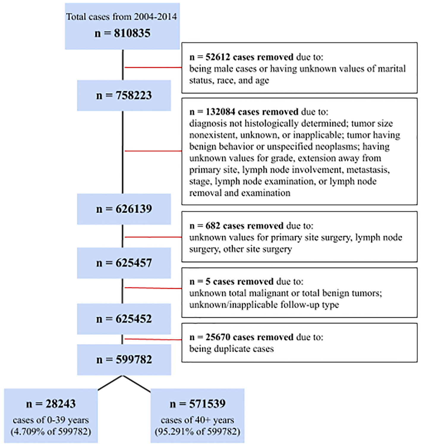 Cases were extracted from the SEER database for the sampling time frame between 2004 and 2014. All female patients who were diagnosed with breast cancer and confirmed with histology and/or cytology were included in the study. The patient’s demographic characteristics including age, race and marital status at the time of diagnosis were collected. Other variables included in the study were tumor characteristics: size, location, histology, extension, metastasis, receptor status, stage and grades of the tumor (high grade: grades III and IV; low grade: grades I and II). All male breast cancer cases were excluded from the study. Breast cancer cases diagnosed at autopsy were also excluded. Variables were excluded from the overall dataset for more accurate analysis, including variables in accordance with old coding systems, variables with too many missing (NA) code values and variables that proved irrelevant to the purpose of the study. Listwise deletion was then performed for the remaining variables to delete values that were unknown, inapplicable, or unspecified. These values were set as missing values and further deleted to create a clean dataset. Any variables with only missing values that remained from the selection process were removed from the dataset to prevent data corruption. Duplicate cases were then dropped from the dataset to prevent inaccurate analysis (Fig. 1).