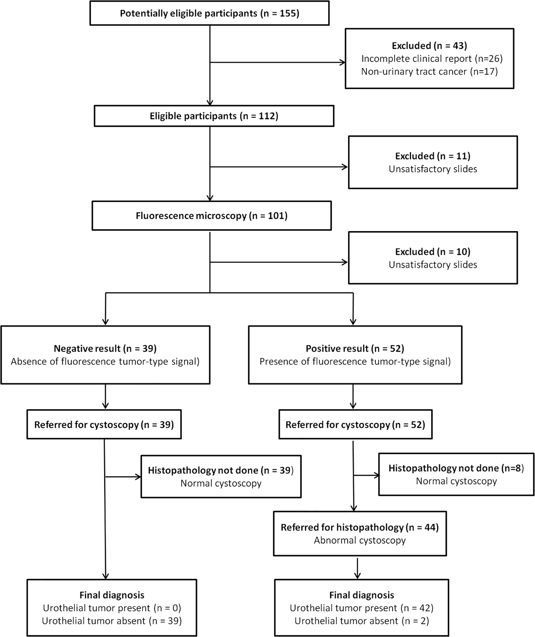 We report a monocentric retrospective study of 155 archived consecutive cases in the cystoscopy’s register of Urology Department at Bicetre Hospital from January 2011 to January 2012. For all patients, a voided urine specimen has been collected before cystoscopy. After exclusion of 26 cases with incomplete clinical report, 17 others with final diagnosis of non-urinary tract cancer (kidney, prostate, etc.) and 11 unsatisfactory urinary slides, 101 patients (19 women and 82 men) were selected (Fig. 1). The mean age was 71.2 years (range 19 - 95).