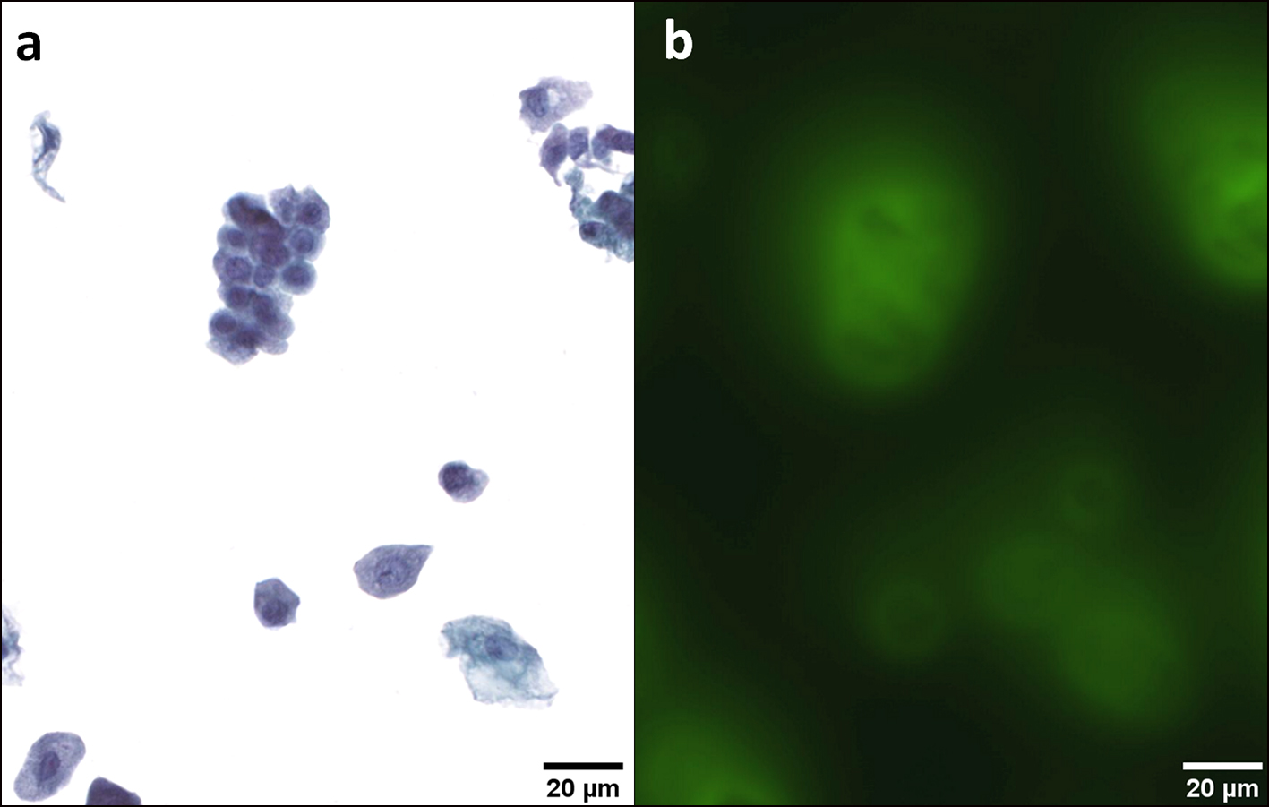 ![]() Click for large image | Figure 4. LGUN. A cluster of urothelial deep cells showing a slightly increased nuclear/cytoplasmic (N/C) ratio, sometimes eccentric and grooved nuclei (a). These cells emit a strong and peri membrane fluorescence signal (b). Transmission (a) and fluorescence microscopic (b) observations of Papanicolaou-stained urothelial cells. LGUN: low-grade urothelial neoplasia. |