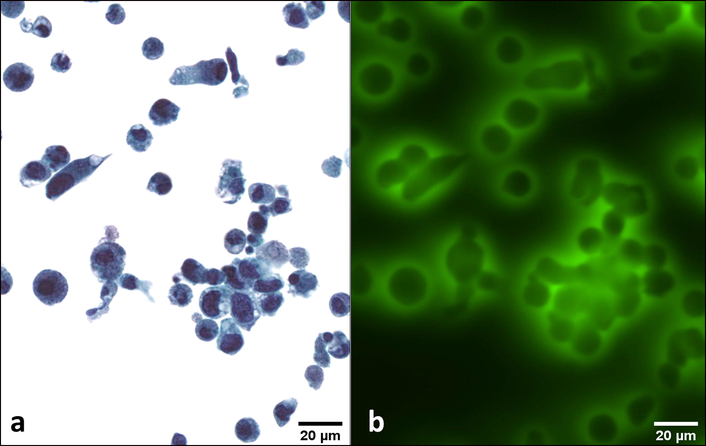 Some studies have reported fluorescence microscopy observation of dysplastic or tumoral cells. Millot et al [35] reported a particular auto-fluorescence emission from cells of high- and low-grade intra-epithelial lesions on unstained cervical smears. Another study reported an induced fluorescence on urothelial cells of HGUC (15/16 cases), LGUN (26/31 cases) and CIS (9/11 cases) from bladder washing after endoscopy with 5-aminolevulanic acid [36]. In our first publication [37], we studied and monitored the fluorescence properties of classical Papanicolaou-stained urothelial cells from urines or cell lines to investigate metabolic changes in normal and tumoral cells. We observed different fluorescence patterns on urothelial cells in various clinical conditions. An intense peri-membrane fluorescence was always observed on urothelial carcinoma cells but also on some reactive or regenerative urothelial cells occurring in inflammation or lithiasis and contrasting by intra-cellular localization and low intensity fluorescence of normal, quiescent urothelial cells. These different fluorescence patterns could be used for detecting urothelial carcinoma in addition to UCCy. This method does not require supplementary urinary samples nor changes to the Papanicolaou staining protocol, unlike other methods using fluorescence as a photodynamic diagnosis [36, 38].