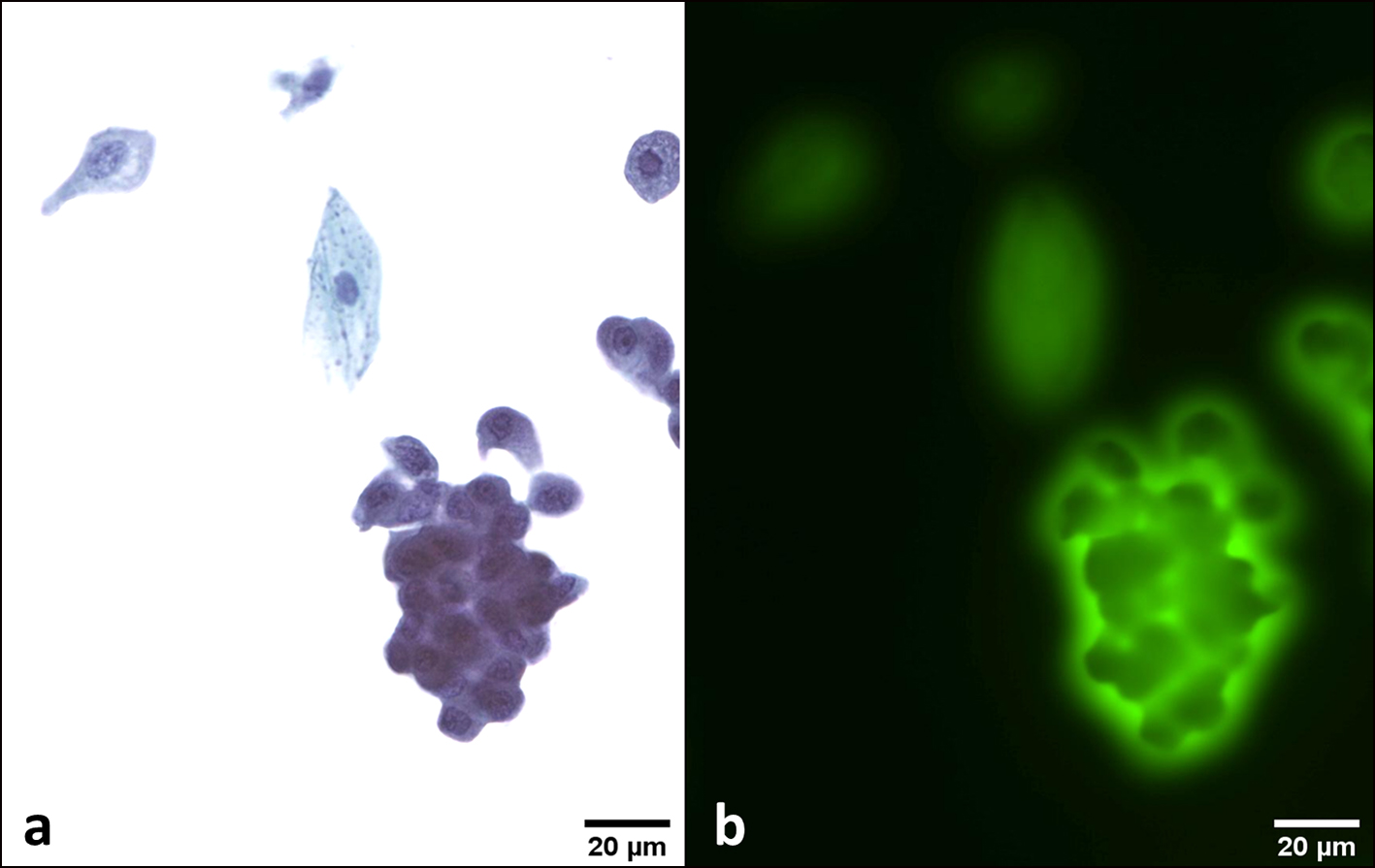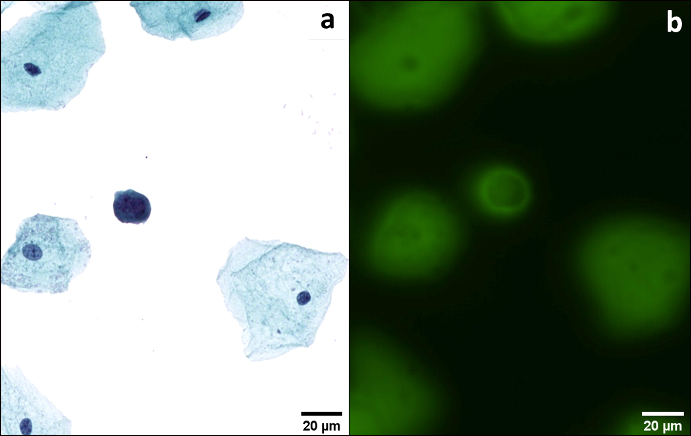 3) Methodology. In contrast to the existing biomarkers that are more time-consuming, more expensive and require the preparation of additional samples, fluorescence localization after Papanicolaou staining is quickly performed on the same slides than UCCy.