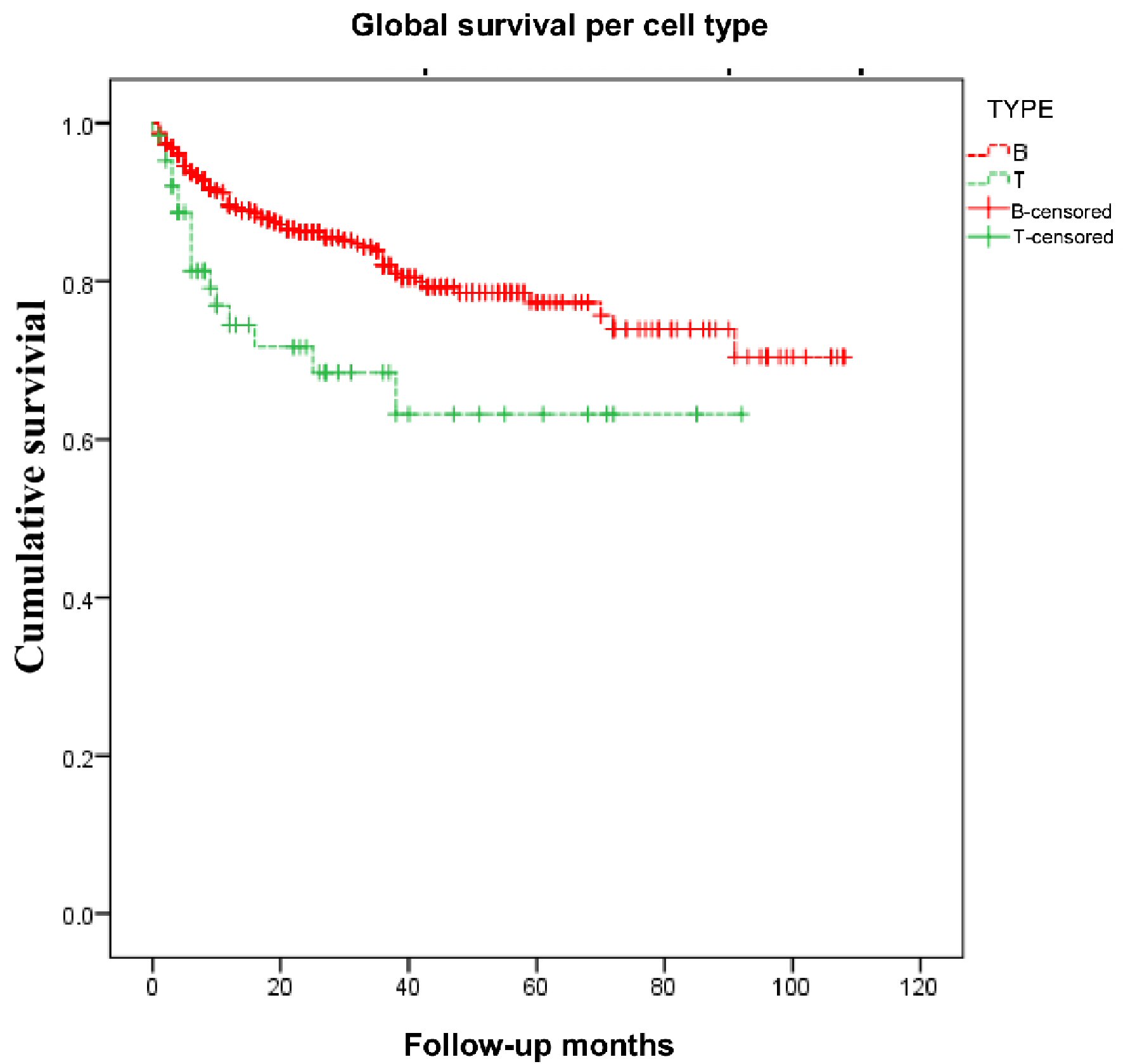 ![]() Click for large image | Figure 1. Overall survival curves by cell type, B-cell non-Hodgkin lymphoma and T-cell non-Hodgkin lymphoma. |