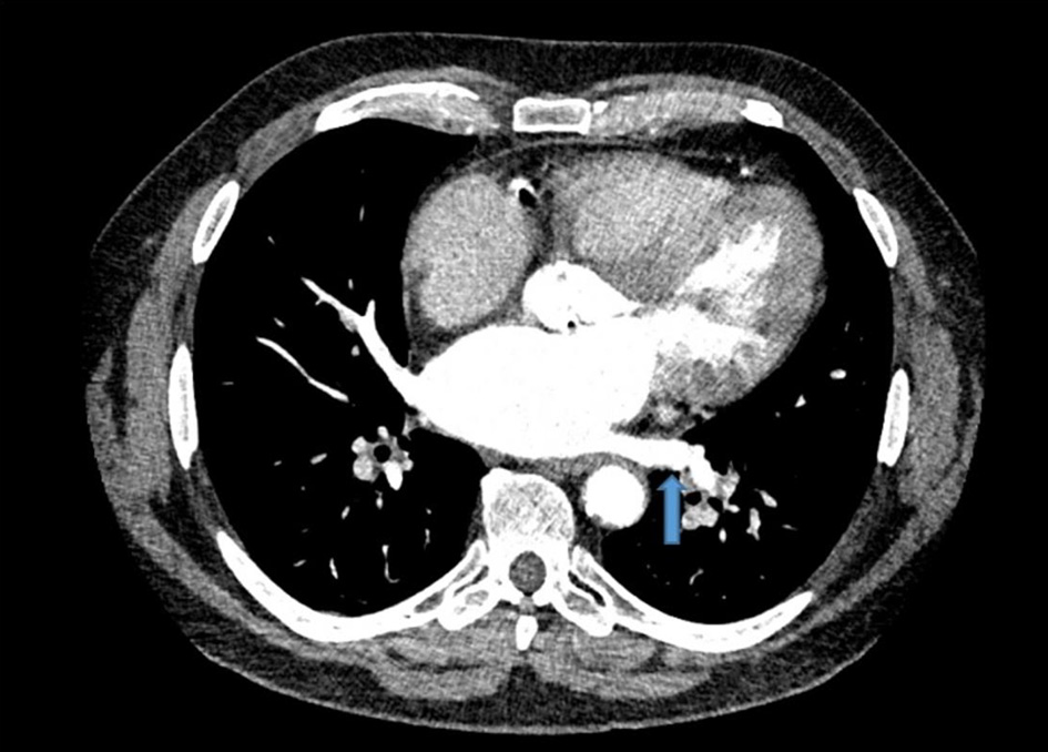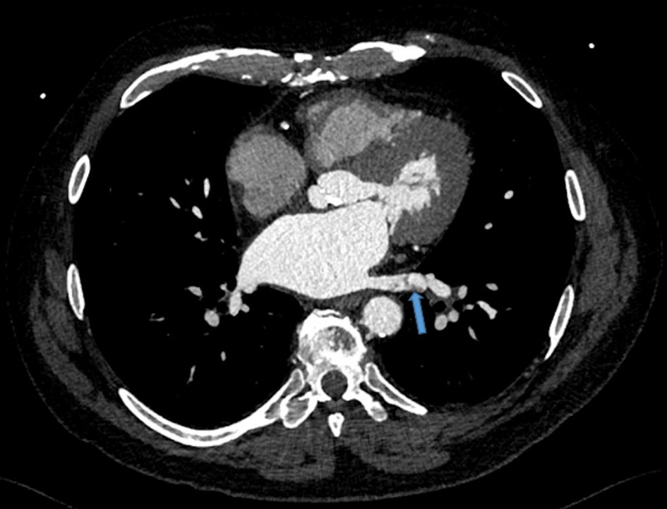 ![]() Click for large image | Figure 2. Resolution of left lower pulmonary vein thrombus. Repeat computed tomography angiogram revealed clot resolution after treatment with rivaroxaban. Similar transverse view of the chest is shown with blue arrow marking the previously seen thrombus location. |
