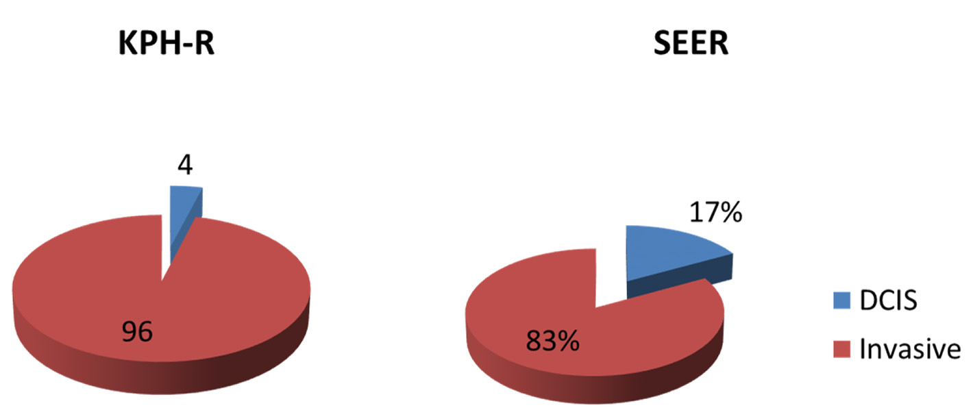 Of the 103 definitive operations for primary breast cancer that were performed between August 2017 and September 2018 at the KPH, four (4%) were for pure ductal carcinoma in situ (DCIS) and 99 (96%) were for primary invasive breast cancers. The average age of presentation for patients with DCIS was 57 years. These patients were excluded from the final analysis. Of the 99 patients with primary invasive carcinoma, 96 (97%) were females and three (3%) were males. Comparative analysis of the ACS 2019 published estimates for invasive breast cancer, where they estimated over 260,000 new cases of invasive breast, showed overall DCIS rate of 18% and only 1% of invasive cancers being diagnosed in men and the SEER database with 17% DCIS and 83% invasive cancers (Fig. 1).
