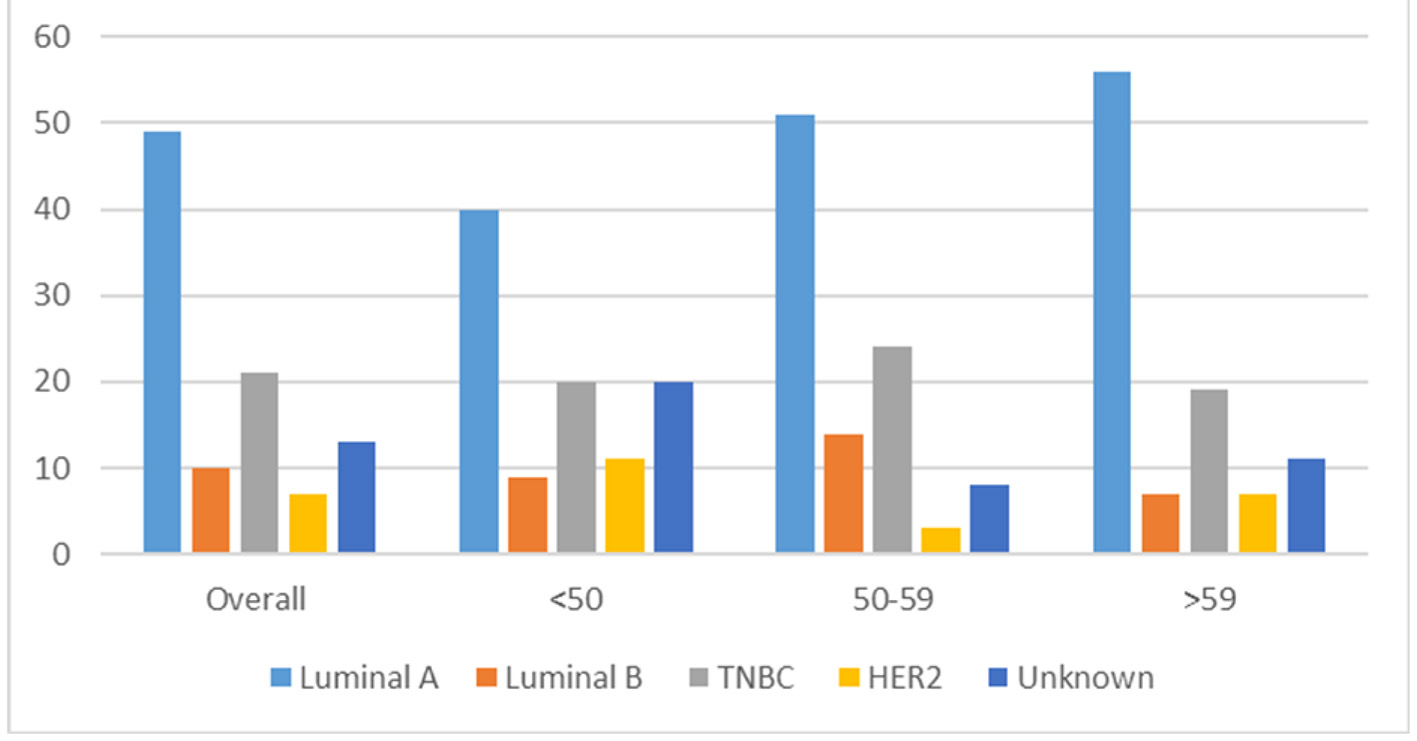 In the context of individualized approach to breast cancer management, it is no longer enough to assess overall population data, but local heterogeneity within populations should be analyzed as well. One of these areas of heterogeneity relates to the distribution of invasive breast cancer biology across age groups. Breast cancer in younger patients have often been found to be associated with more aggressive behavior, advanced disease at presentation and poorer overall survival particularly in low- and middle-income countries [7-9]. Conversely, through associations such as the Society of Surgical Oncology, breast cancer in the elderly has been purported to have more favorable outcomes with their choosing wisely guidelines, recommending de-escalation of axillary lymph node surgery in elderly patients with favorable invasive breast cancer biology [10].