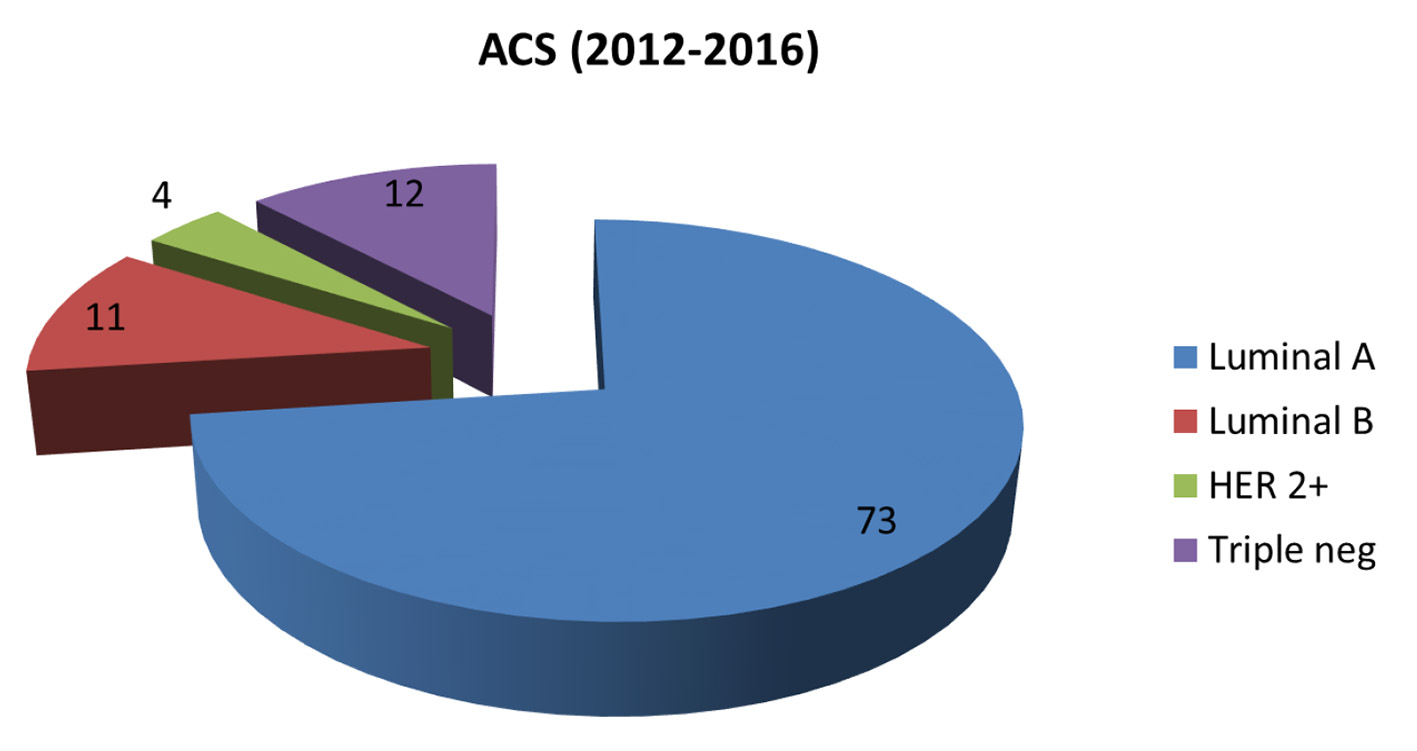 ![]() Click for large image | Figure 3. Pie chart depicting distribution of new invasive breast cancers (in percentages) by cancer subtype in the American Cancer Society database 2012 - 2016. |