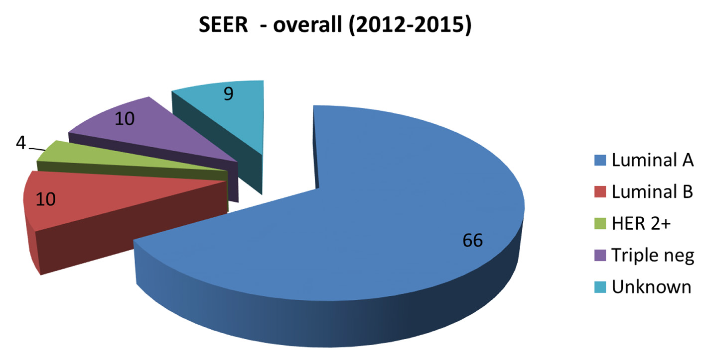 ![]() Click for large image | Figure 4. Pie chart depicting the distribution of new invasive breast cancers (in percentages) by cancer subtype in the SEER database 2012 - 2015. SEER: Surveillance Epidemiology and End Result. |