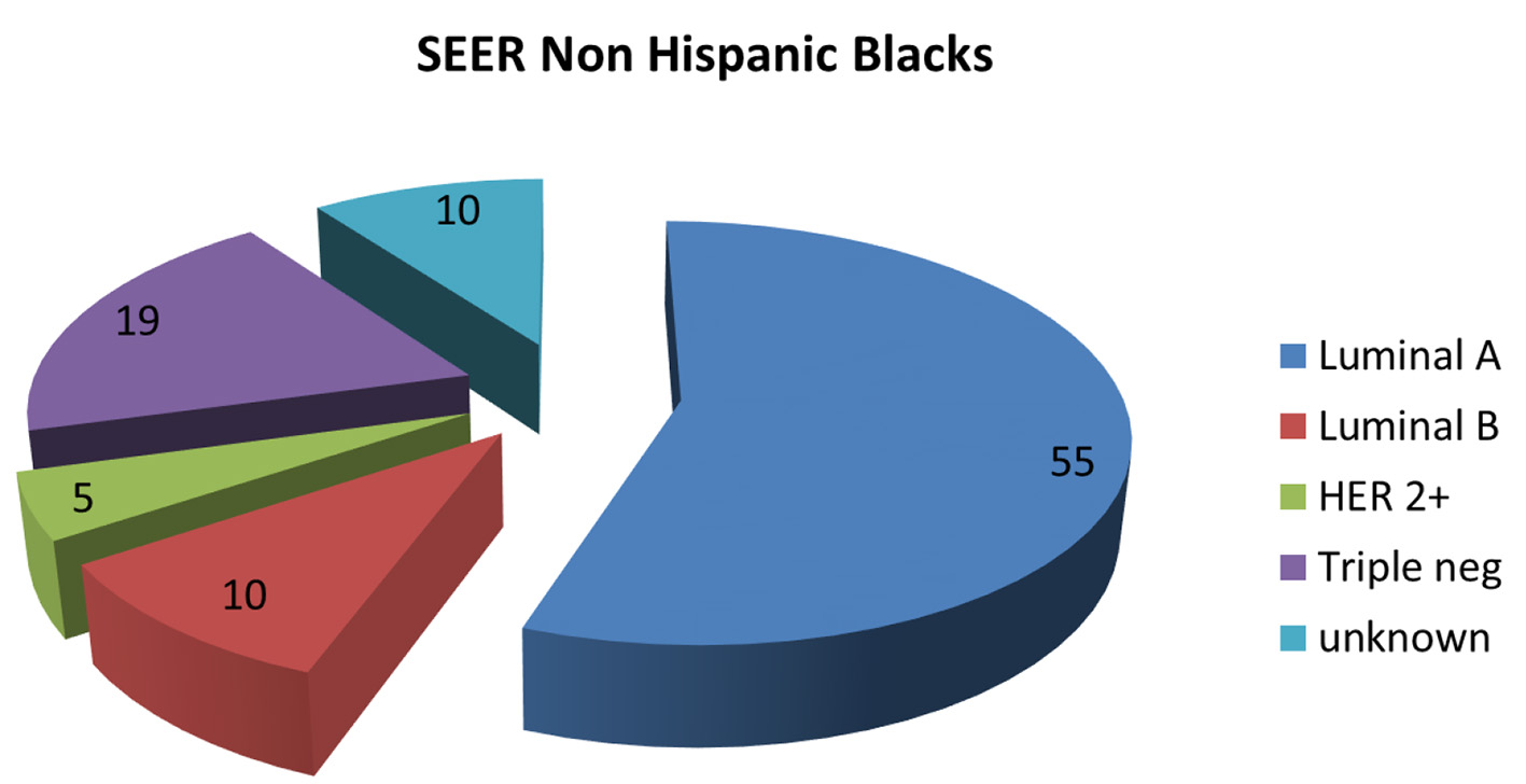 ![]() Click for large image | Figure 5. Pie chart depicting distribution of new breast cancers in non-Hispanic Blacks by cancer subtype in the SEER database 2012 - 2015. SEER: Surveillance Epidemiology and End Result. |