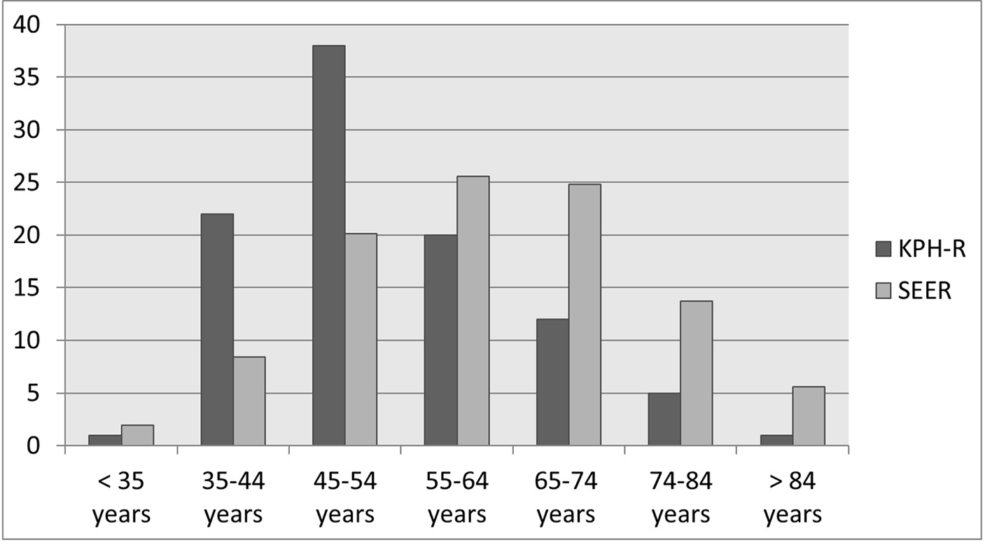 The average age of presentation for patients with primary invasive breast cancer in the KPH-R was 54 years for females and 67 years for males, while the mean overall age at presentation for females in the ACS data was 62 years with African American women presenting at a slightly earlier age (60 years) than non-Hispanic Caucasian women (63 years). Our findings therefore reflect much earlier ages of presentation for invasive breast cancers in the KPH-R cohort compared with both the non-Hispanic Caucasians and the African American patients in the ACS database. We found that 36% of our patients were in the age group < 50 years, and this was twice the corresponding rate reported in the ACS database (18%). Patients in the age block 50 - 59 years accounted for 37% and only 27% were older than 59 years in the KPH-R (Fig. 1).