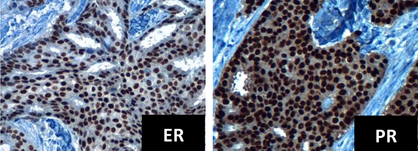 ![]() Click for large image | Figure 1. Immunohistochemistry for ER and PR positives, intensity +++ in 95% tumor cells (× 40 field). ER: estrogen receptor; PR: progesterone receptor. |