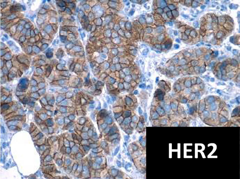 ![]() Click for large image | Figure 2. Immunohistochemistry for HER2 positive (× 40 field). HER2: human epidermal growth factor receptor 2. |