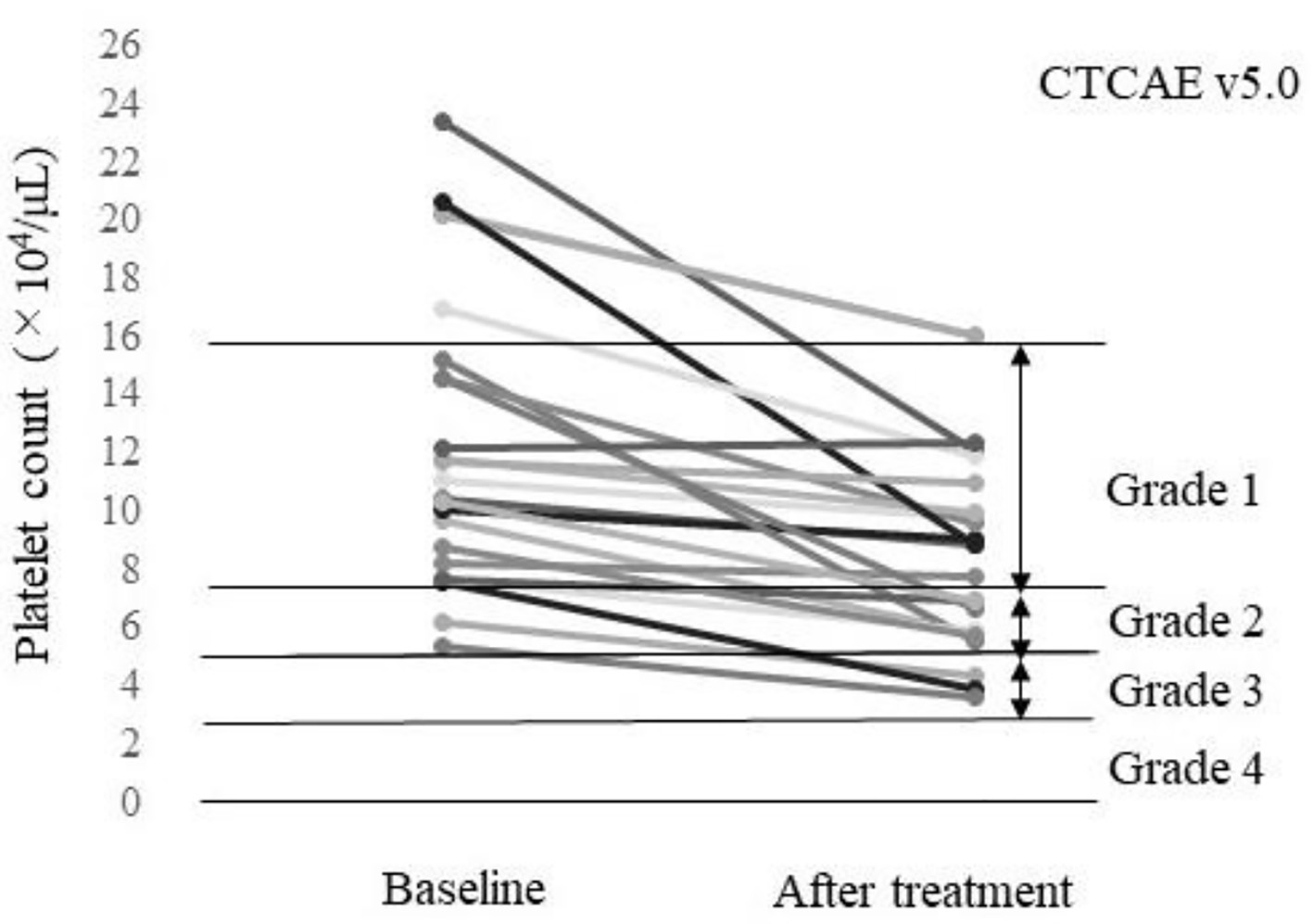 ![]() Click for large image | Figure 1. Platelet count of each patient at baseline and after treatment (n = 23). A total of 52.2% (12/23) of the patients had a worsened platelet count grade according to the Common Terminology Criteria for AEs v5.0 (CTCAE v5.0). |