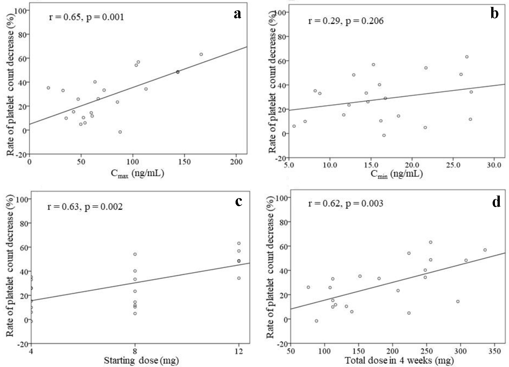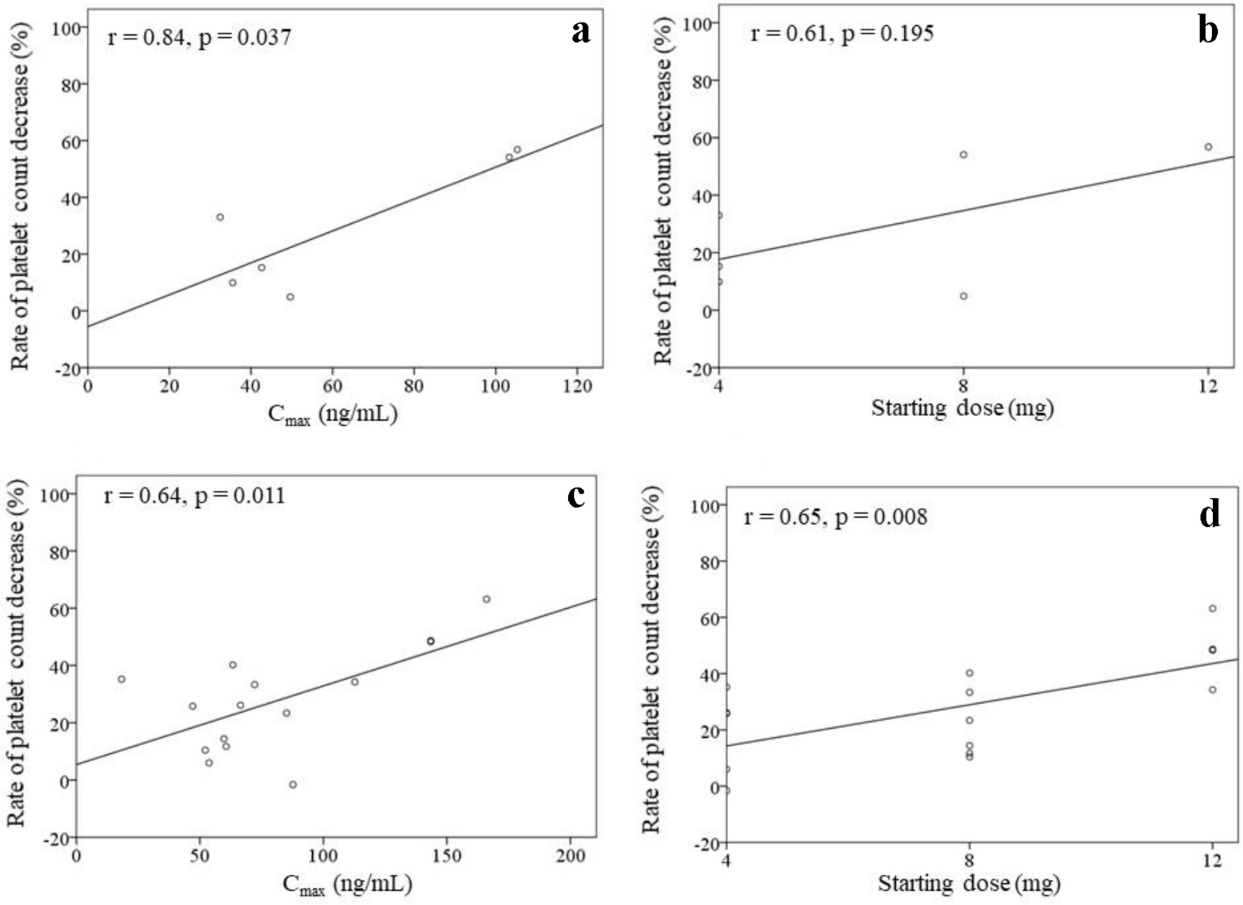 Figure 2 shows the correlations between the rate of platelet count decrease and the Cmax, Cmin, starting dose, and total dose within 4 weeks of treatment initiation (n = 21). There were correlations between the rate of platelet count decrease and the Cmax (r = 0.65, P = 0.001), starting dose (r = 0.63, P = 0.002), and total dose within 4 weeks (r = 0.62, P = 0.003). No significant correlation was found between the rate of platelet count decrease and the Cmin (r = 0.29, P = 0.206). The correlations between the rate of platelet count decrease and the Cmax as well as the starting dose were analyzed in patients with (n = 15) or without (n = 6) dose modifications (Fig. 3). A significant correlation was found between the rate of platelet count decrease and the Cmax (r = 0.84, P = 0.037) in patients without dose modifications within 4 weeks of treatment initiation (n = 6). Significant correlations were also found between the rate of platelet count decrease and the Cmax (r = 0.64, P = 0.011) as well as the starting dose (r = 0.65, P = 0.008) in patients with dose modifications within 4 weeks of treatment initiation (n = 15).