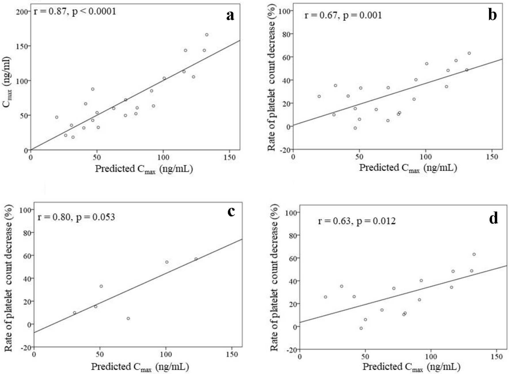 ![]() Click for large image | Figure 4. Correlation between the Cmax and the predicted Cmax (a) in all patients (n = 23). Correlations between the predicted Cmax and the rate of platelet count decrease (b-d). (b) Patients without drug withdrawal within 4 weeks of lenvatinib initiation (n = 21). (c) Patients without dose modifications within 4 weeks of lenvatinib initiation (n = 6). (d) Patients with dose modifications within 4 weeks of lenvatinib initiation (n = 15). |
