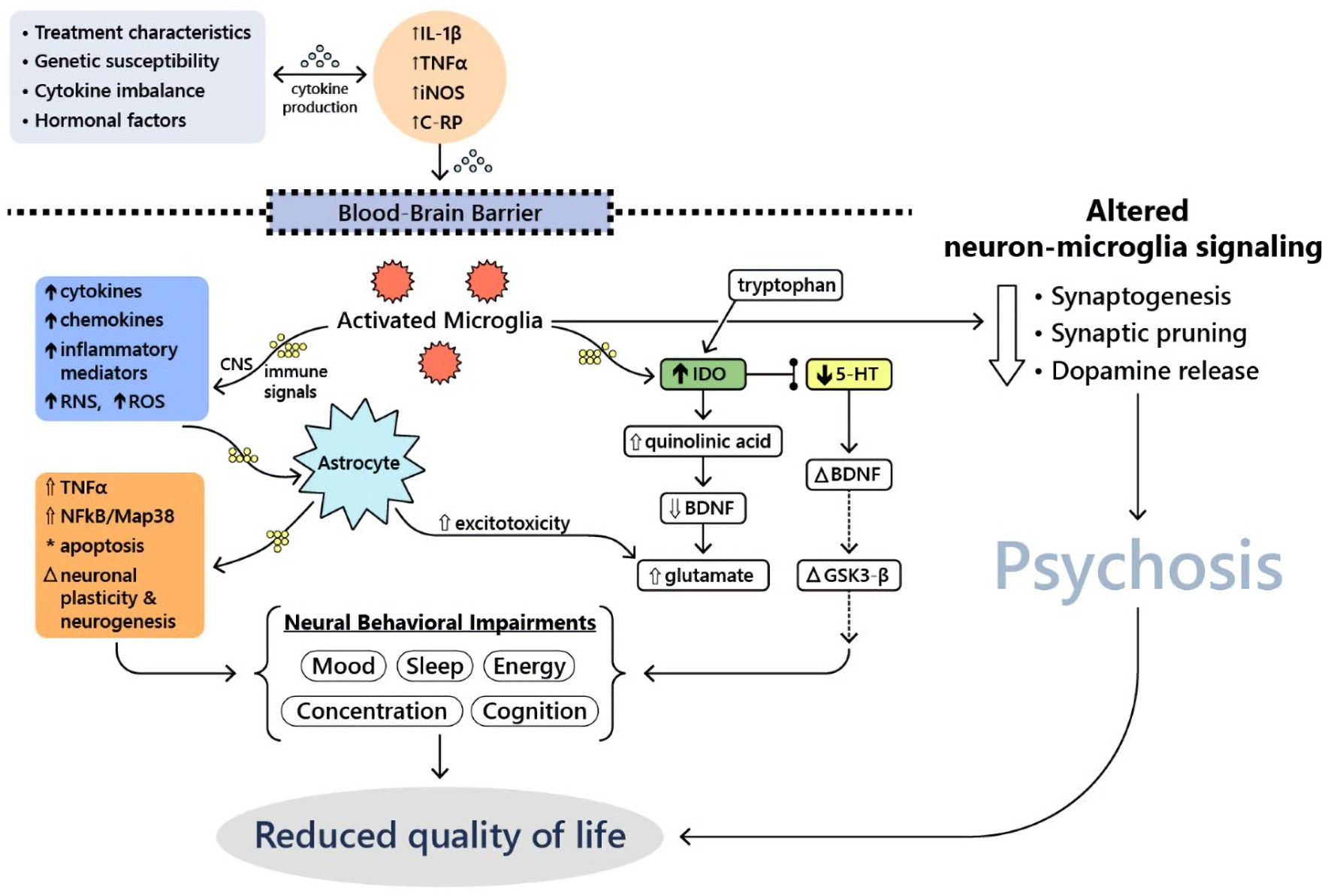 There have also been six published incidence studies completed thus far that have analyzed the relative risk of cancer in patients with schizophrenia compared to the general population. These papers suggested that the tumor suppressor gene p53 may play a role in the relatively decreased incidence of malignancy in patients with schizophrenia: p53 may be overly active in these patients, thereby increasing levels of apoptosis at baseline and killing cells prior to becoming cancerous [9]. Recent evidence suggests that chemotherapy-induced changes may be associated with excessive neuroinflammatory response and subsequent behavioral decompensation [10]. Activated microglia may be involved in metabolism of inflammatory cytokines and neurotransmitters in patients with severe manic [11] or psychotic reactions [12]. Those changes may lead to long-term alteration of synaptic transmission, dopamine metabolism [12] and psychosis development [13]. Neuroinflammatory hypothesis may explain the therapeutic potential of various psychopharmacological agents in modulation of behavioral disturbances among cancer patients. For example, lithium can modulate adenylate cyclase-related GPCR signaling pathway and glycogen synthase kinase 3 beta (GSK-3β) activity [14]. Figure 1 summarizes other potential molecular and cellular mechanisms underlying mood disturbances and psychosis in cancer patients.