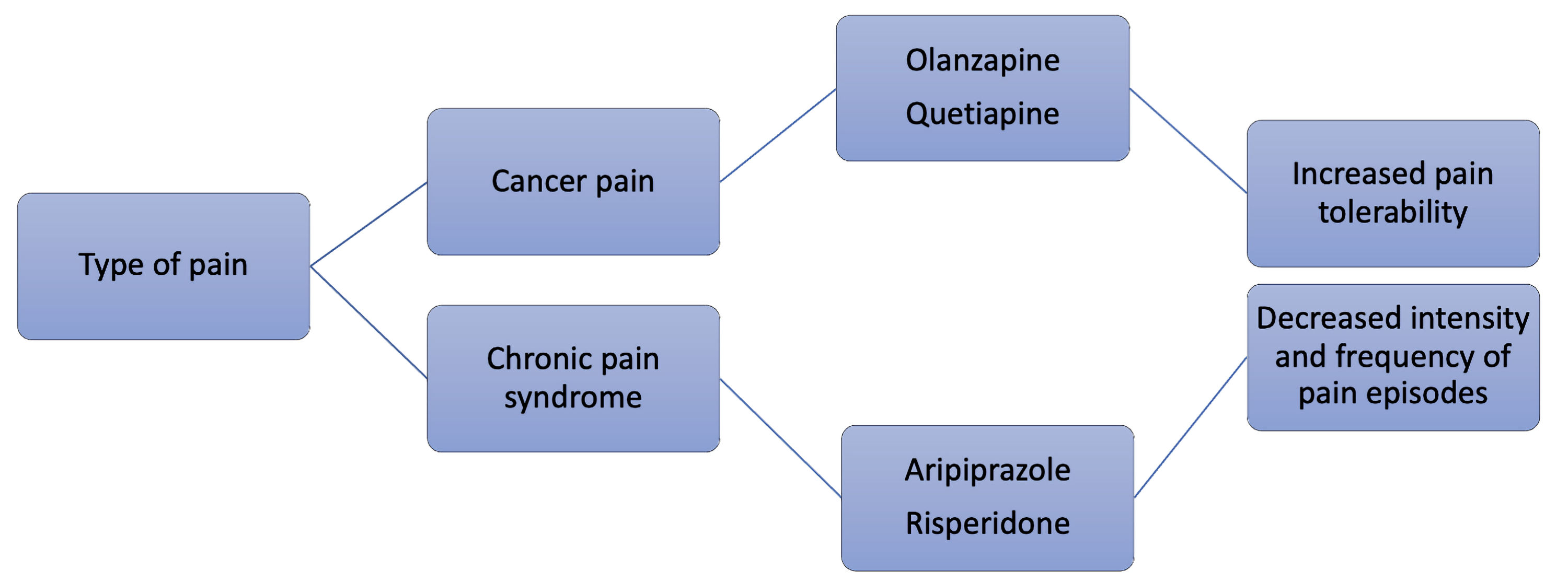 Atypical antipsychotics can be utilized for various types of chronic pain, but an intriguing opportunity for use in treating cancer pain is being researched. Oftentimes, cancer pain is chronic, as most people battle cancer for longer than 3 months at a time. One study showed that around 59% of patients experienced pain during cancer treatment. About 64% of these patients reported advanced cancer pain. Even for patients with curative treatment, 33% still claim to experience pain [78]. Regarding already established guidelines, the World Health Organization (WHO) cancer pain management guidelines suggest using non-opioid analgesics when initiating therapy for a patient. This is due to multiple factors: opioids are not only highly addictive but also have many side effects. A small study that assessed the benefit of atypical antipsychotics for the pain of eight cancer patients who were already titrated on opioids found that the drugs, unfortunately, did not control the pain. Using olanzapine as the drug of choice, the patients reported a significant reduction in their daily pain scores, and it was also noted that their daily opioid use decreased a great amount as well. The patients also had cognitive disorders and showed positive improvements in cognitive impairment and anxiety [79]. Further, when studied on mouse models, quetiapine showed analgesic effects on cancer-induced bone pain [80]. There is still much more to learn regarding the treatment of cancer pain with atypical antipsychotics. Currently, the theory is mainly supported through animal models and small cases studies. Nonetheless, antipsychotics have generally shown efficacy in pain management across the board and are an innovative approach to treating chronic pain in cancer patients with concomitant psychosis. Figure 2 summarizes analgetic properties of certain antipsychotics.