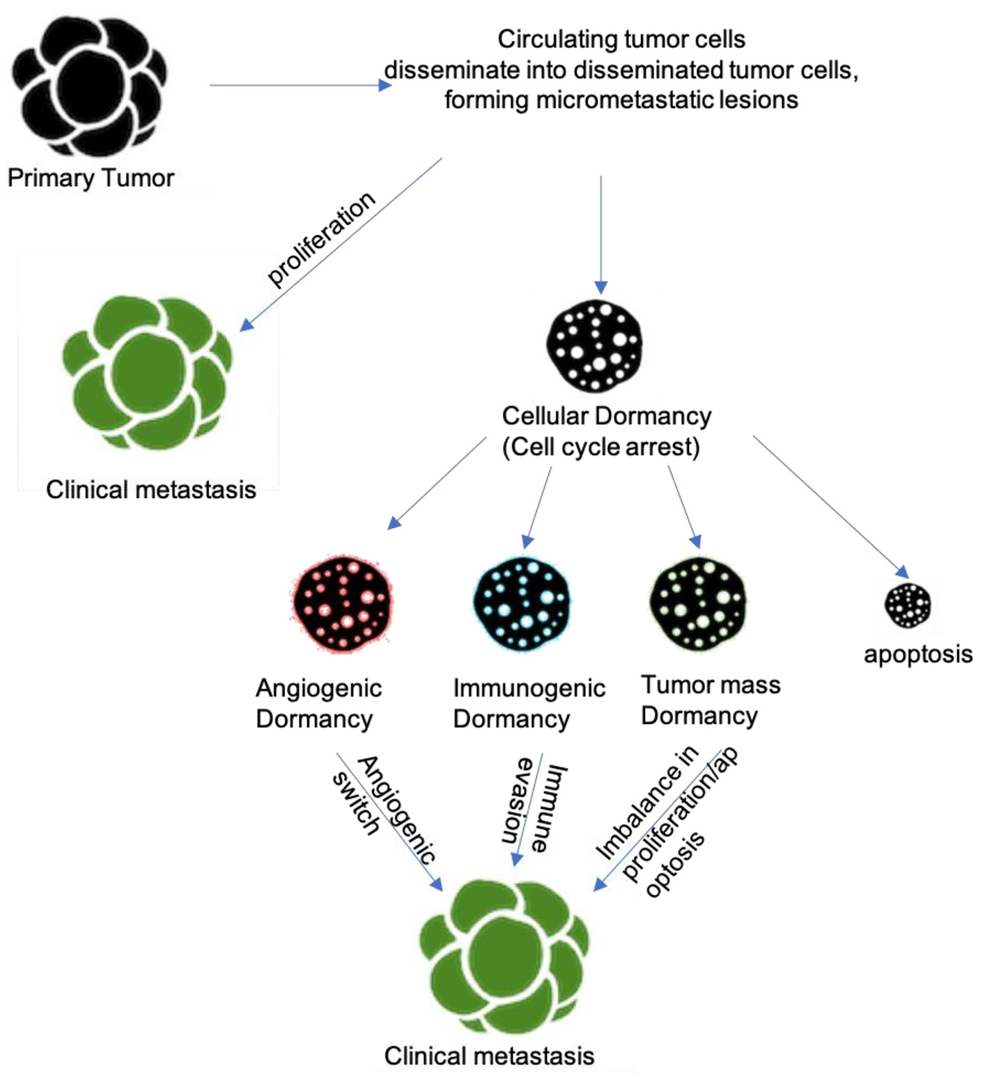 Metastatic cancer can arise years after treatment of the primary tumor because residual tumor cells can enter dormancy and evade elimination by anti-neoplastic therapies. The mechanisms underlying this phenomenon have been investigated and a number of hypotheses have been proposed. Tumor mass dormancy involves a balance between apoptotic and proliferative cells, keeping a micrometastatic lesion constant in size. This induces a need for blood supply which involves angiogenic dormancy. Cellular dormancy is also considered a mechanism of dormancy, where dormancy is induced due to cells entering a quiescent, reversible, growth-arrested state. In addition to all of these mechanisms, important changes in the tumor microenvironment, including the extracellular matrix, the oxygenation levels of the environment, and endoplasmic reticulum stress, are involved in inducing and maintaining tumor dormancy. Since dormant tumors are commonly known to be resistant to chemotherapy, gaining more knowledge of the mechanism of dormant tumor cells is of importance, as it can lead to the development of future treatment strategies.