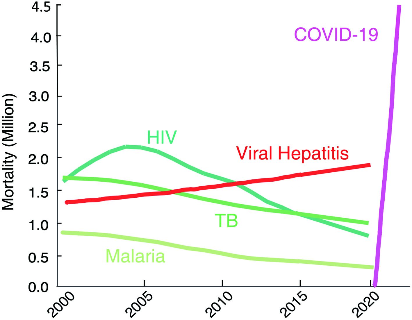 ![]() Click for large image | Figure 1. The death toll from coronavirus disease 2019 (COVID-19) goes far beyond that of any of human immunodeficiency virus (HIV)/tuberculosis (TB)/malaria. The number of deaths from COVID-19 surpassed by far that of fatalities of the top three communicable diseases (CDs): HIV/acquired immunodeficiency syndrome (AIDS), tuberculosis, and malaria. https://www.worldlifeexpectancy.com/world-rankings-total-deaths; https://www.nytimes.com/interactive/2021/world/covid-vaccinations-tracker.html. |