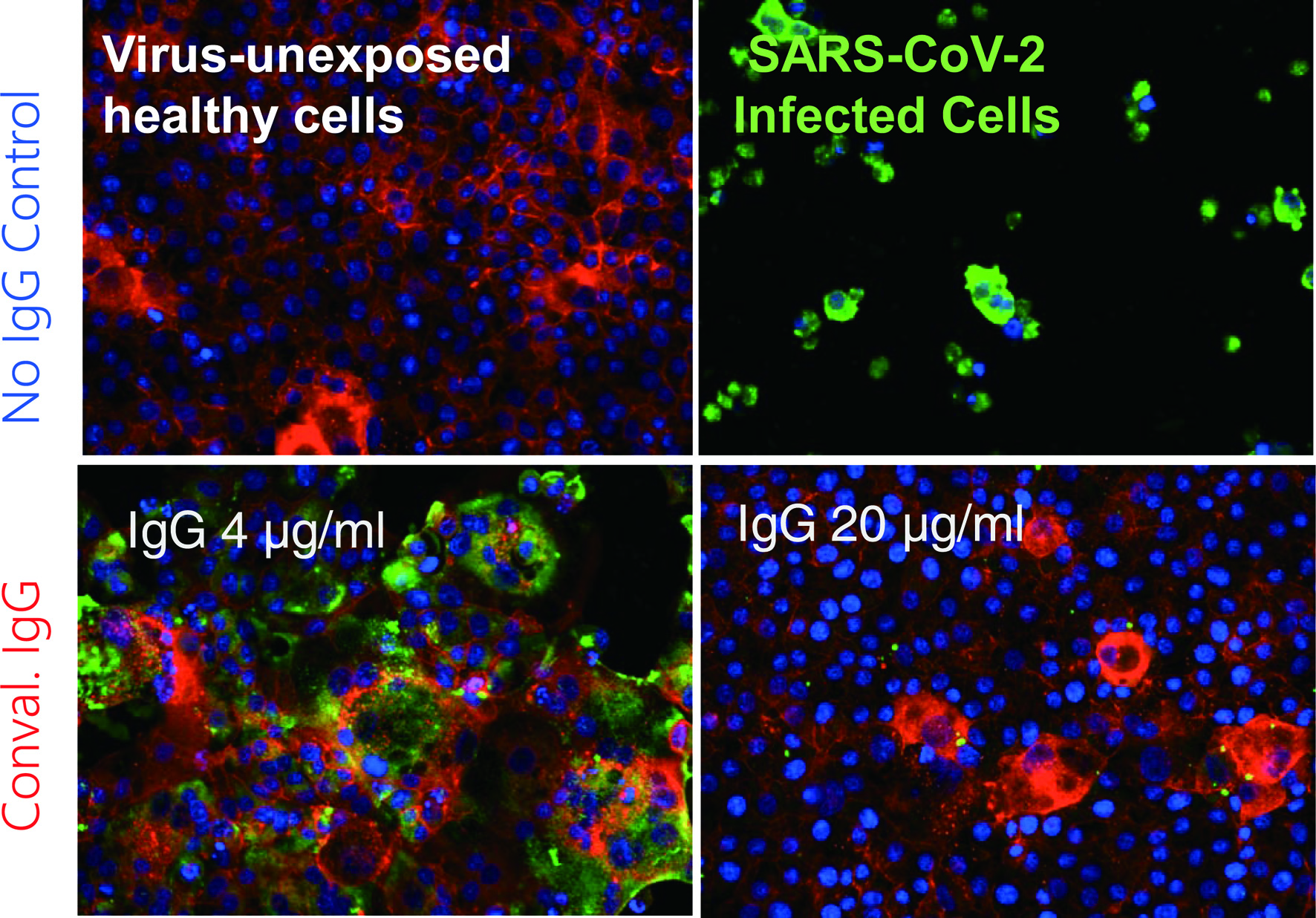 ![]() Click for large image | Figure 2. Coronavirus disease 2019 (COVID-19)-convalescent plasma-derived IgG completely blocks the infectivity and cytopathic effect of severe acute respiratory syndrome coronavirus 2 (SARS-CoV-2) in test tube. The method, immunocytochemistry, reveals robust cytoskeleton (filamentous actins stained in red) in virus-unexposed healthy target VeroE6TMPRSS2 cells (upper left). If infected with SARS-CoV-2, cytoskeletons are destroyed, and viral antigens are produced and stain in green and the cells are eventually destroyed (upper right). However, if the cells are exposed to SARS-CoV-2 and cultured in the presence of 4 µg/mL IgG purified from a serum sample from a COVID-19-convalescent patient, they are partially protected from the infection. In the presence of IgG 20 µg/mL, the infectivity and cytopathic effect of the virus is completely blocked. These data strongly suggest that a sufficient amount of SARS-CoV-2-neutralizing antibody can completely protect target cells from SARS-CoV-2. Cellular actin filaments, cellular nuclei, and viral antigens are stained in red (TexasRed-X), blue (DAPI), and green (Alexa Fluor 488), respectively [8]. |