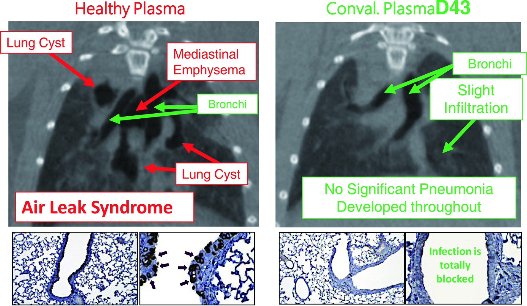 ![]() Click for large image | Figure 3. Hamsters receiving coronavirus disease 2019 (COVID-19)-convalescent plasma are protected from having pneumonia. Micro-computed tomography (mCT) scan was used to image the hamster lungs. For immunohistochemistry, the IgG fraction of serum from a convalescent COVID-19 individual was employed as the primary antibody and peroxidase conjugated goat polyclonal anti-human IgG antibody was used as the secondary antibody. For visualization, 3,3'-diaminobenzidine (DAB)-peroxidase enzyme reaction was performed. While Syrian hamsters, which were SARS-CoV-2-inoculated and received control healthy plasma developed severe pneumonia by day 8 following viral inoculation (upper left), hamsters which were inoculated with severe acute respiratory syndrome coronavirus 2 (SARS-CoV-2) but received COVID-19-convalescent human plasma (D43) were protected from infection by SARS-CoV-2 and developed no pneumonia (upper right). The two lower left insets show that many airway cells of the hamster had been infected with SARS-CoV-2 and stained in dark brown; however, the two lower right insets show no infection on the airway cells [9]. |