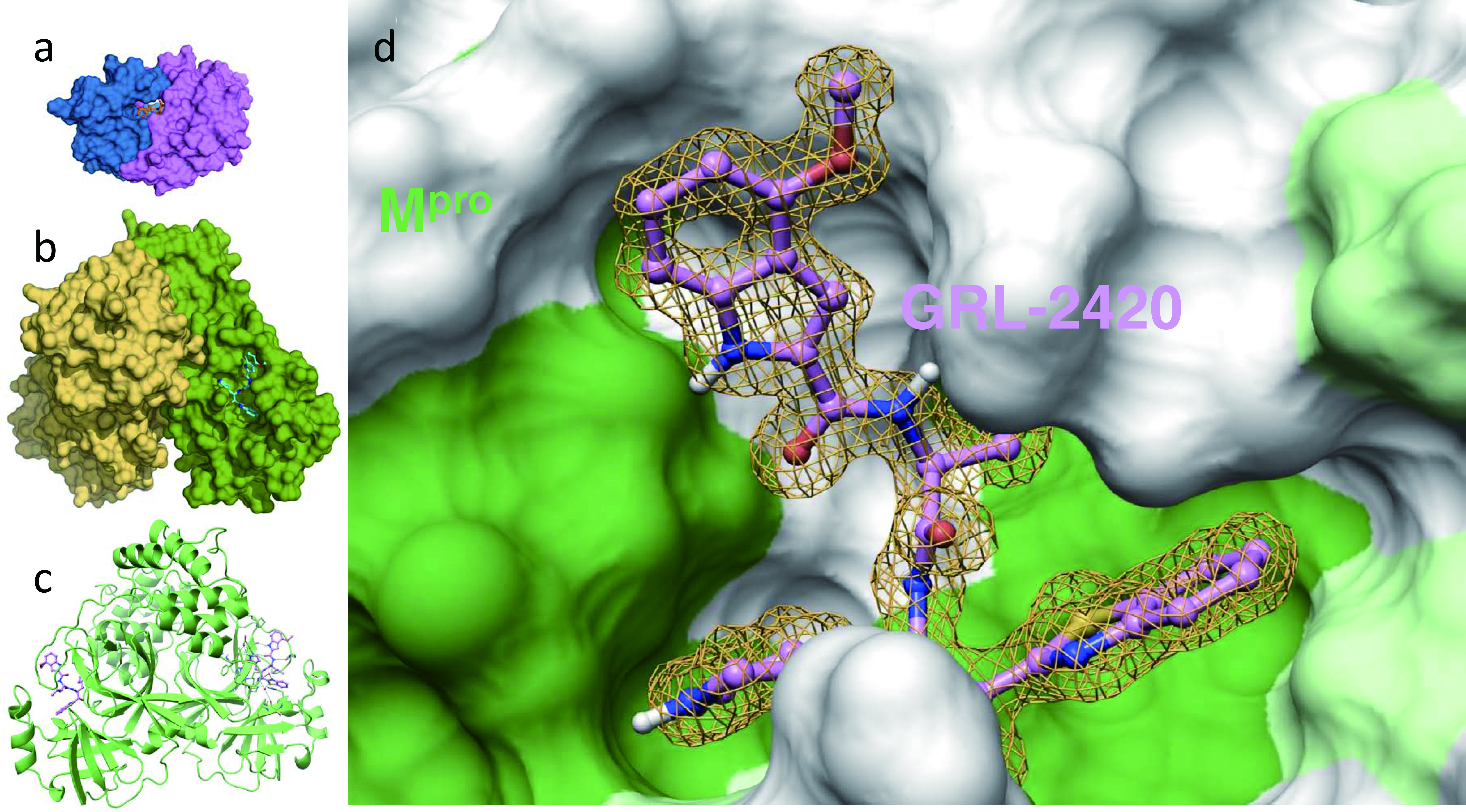 ![]() Click for large image | Figure 4. An Mpro inhibitor, GRL-24205h, covalently binds to Mpro , blocks Mpro’s enzymatic activity, and potently blocks severe acute respiratory syndrome coronavirus 2 (SARS-CoV-2) infectivity and replication. Inset (a) shows human immunodeficiency virus (HIV)’s protease bound by its inhibitor, darunavir, and insets (b) and (c) show SARS-CoV-2’s protease (Mpro) bound by an Mpro inhibitor, GRL-2420/5h, in the forms of surface and ribbon representations, respectively. Note that the size of Mpro is three-times larger than that of HIV’s protease. Inset d shows the hydrophobic cavity of Mpro’s enzymatic active site, into which GRL-2420/5h snugly lodges and blocks the enzymatic activity. It is of note that the algorithm of HIV/acquired immunodeficiency syndrome (AIDS) drug development serves as the basis of study of potential COVID-19 drugs [11]. |