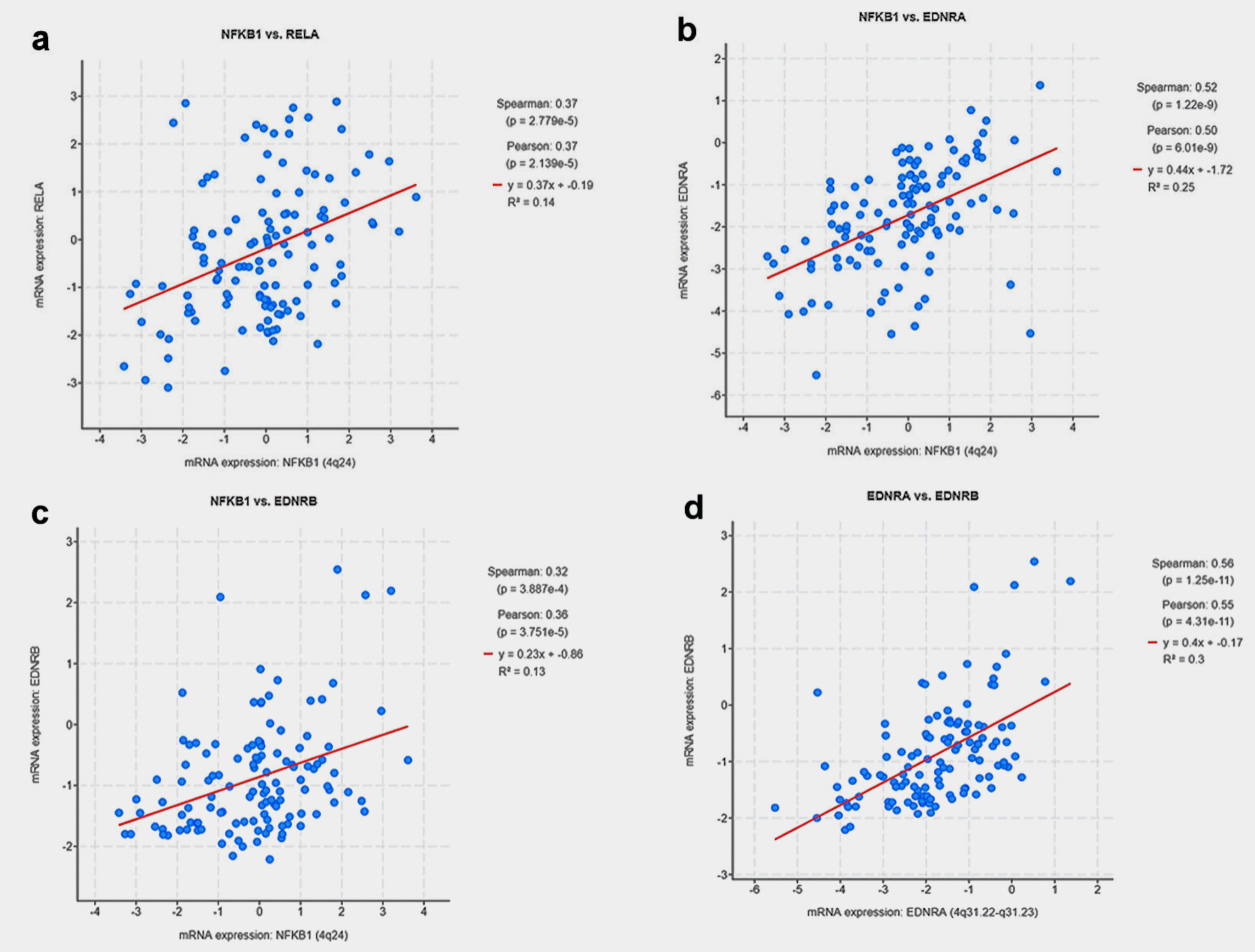 ![]() Click for large image | Figure 3. Scatter plots depicting the correlation of mRNA expression between: (a) NFKB1 and RELA, (b) NFKB1 and EDNRA, (c) NFKB1 and EDNRB, (d) EDNRA and EDNRB genes. |
