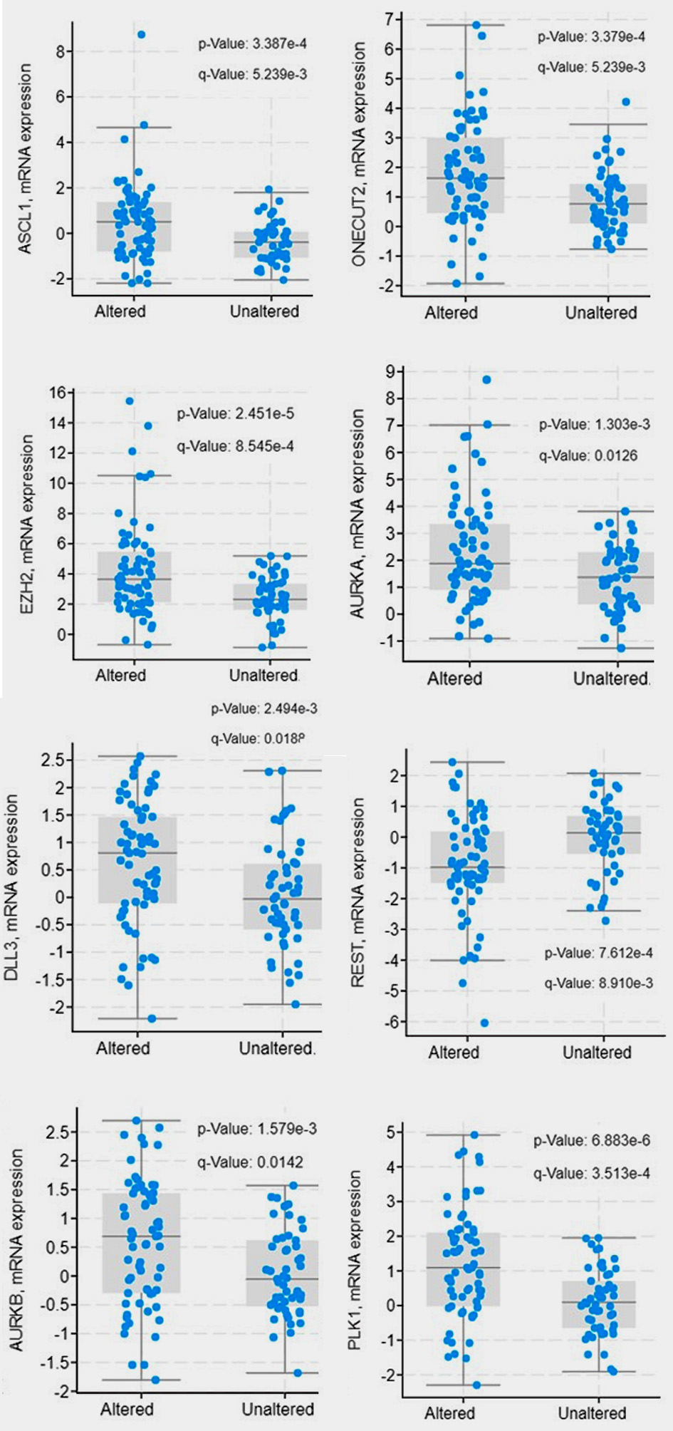 First, we found that a higher number of tumors with altered NF-κB and endothelin axis gene expression displayed copy number losses of the tumor suppressors RB1 (7.2% vs. 1.7%), TP53 (2.9% vs. 1.7%) and PTEN (14.5% vs. 7.0%), compared to those without NF-κB and endothelin axis gene alterations (Table 2, Fig. 5). Second, mRNA expression of ASCL1 (log ratio = 0.88; q < 0.001), ONECUT2 (log ratio = 0.93; q < 0.001), DLL3 (log ratio = 0.58; q = 0.019), AURKA (log ratio = 0.94; q = 0.013), AURKB (log ratio = 0.53; q = 0.014), PLK1 (log ratio = 1.08; q < 0.001), and EZH2 (log ratio = 1.87; q < 0.001) were enriched in patients with tumors harboring alterations in endothelin axis and NF-κB subunit genes whereas transcriptional repressor REST was downregulated (log ratio = -0.86; q < 0.001) (Fig. 6).