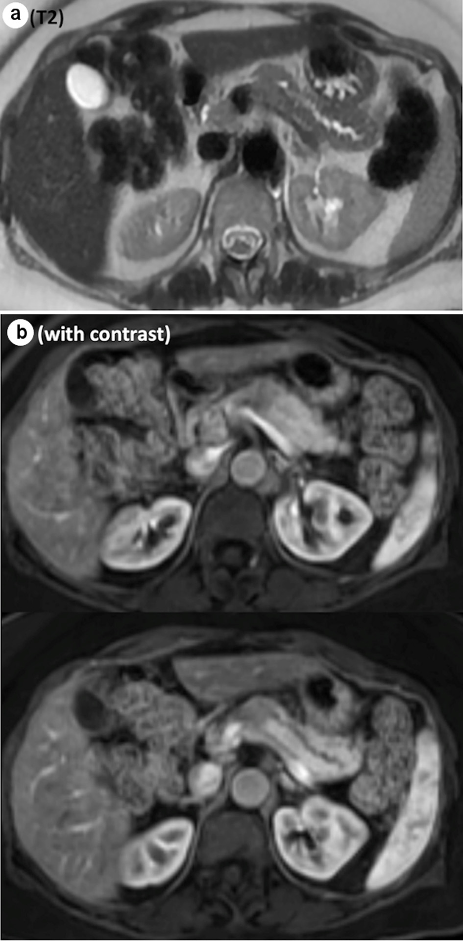 ![]() Click for large image | Figure 1. Representative images from MRI. (a) Abrupt cut off of the main pancreatic duct on the T2 sequence. (b) Hypoenhancing mass, measuring 2.4 × 1.9 × 3.2 cm, on the contrast study. MRI: magnetic resonance imaging. |