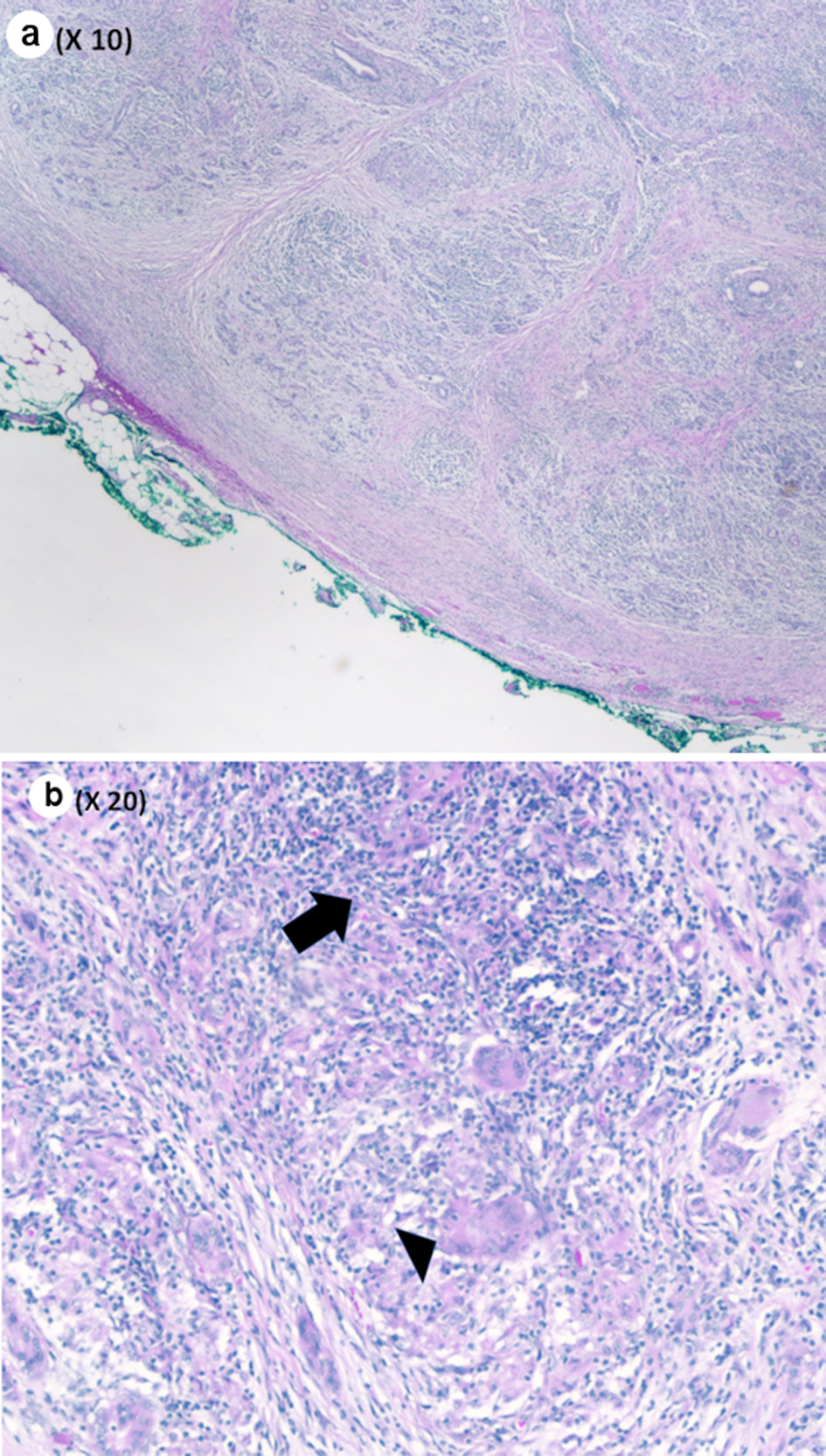 ![]() Click for large image | Figure 2. (a) Pancreas parenchyma with intact lobular architecture and exuberant chronic inflammation (low power, × 10). (b) Chronic inflammatory infiltrate (black arrow) and giant cell (black arrowhead) (medium power, × 20). |