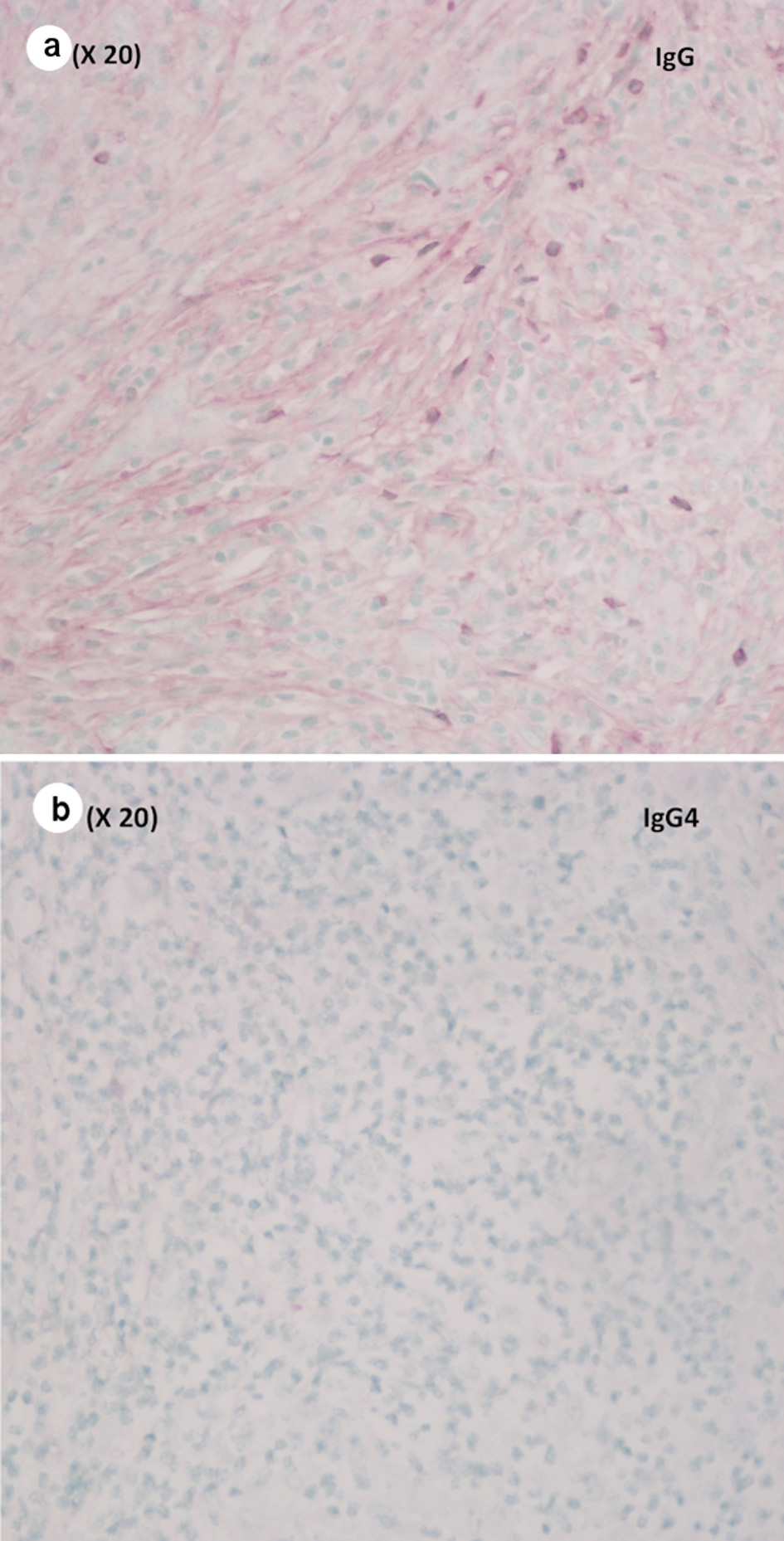 ![]() Click for large image | Figure 3. (a) Focally positive immunostain for IgG (medium power, × 20). (b) Negative immunostain for IgG4 (medium power, × 20). IgG4: immunoglobulin G4. |