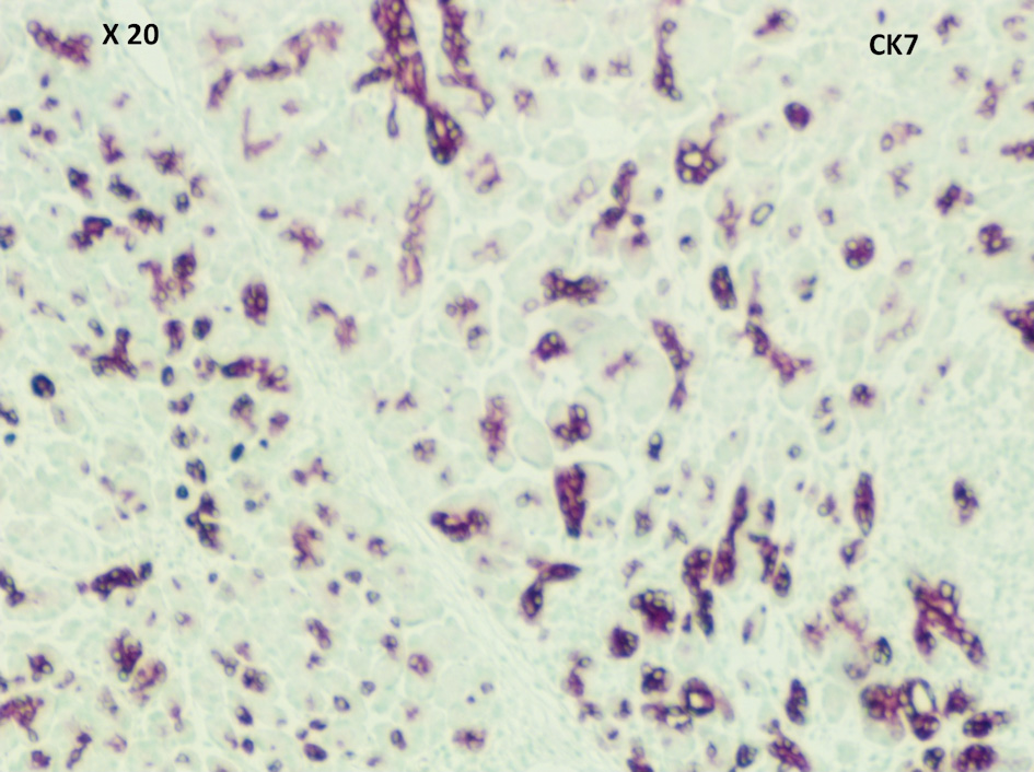 ![]() Click for large image | Figure 4. CK-7 was positive in epithelial cells (medium power, × 20). CK-7: cytokeratin 7. |