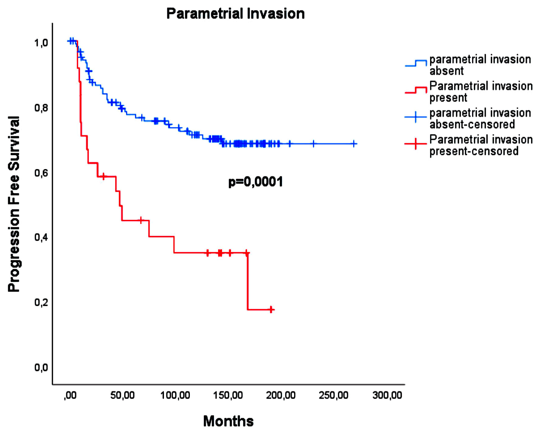 ![]() Click for large image | Figure 1. The relationship between disease-free survival and parametrial involvement. |