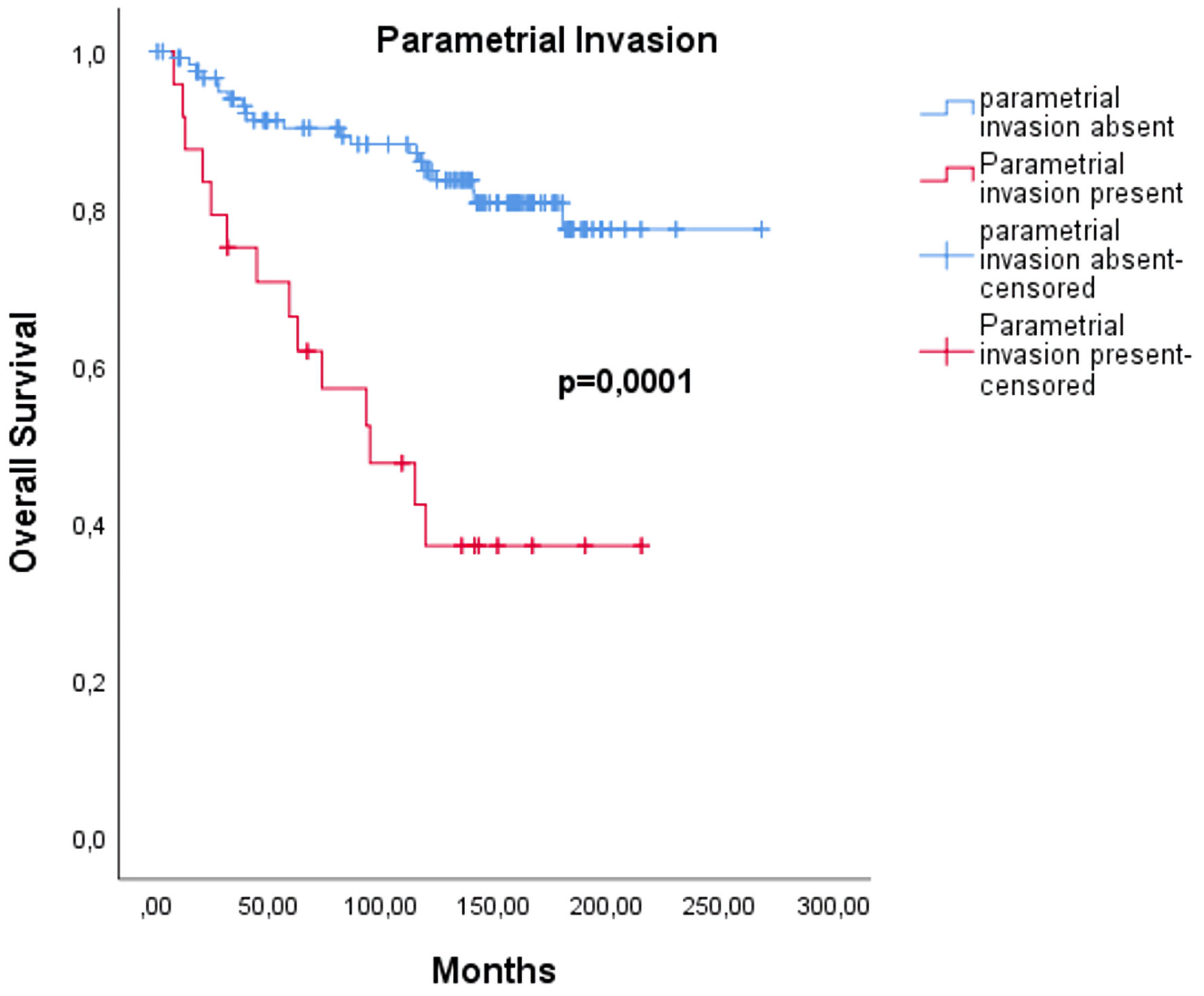 ![]() Click for large image | Figure 2. The relationship between overall survival and parametrial involvement. |