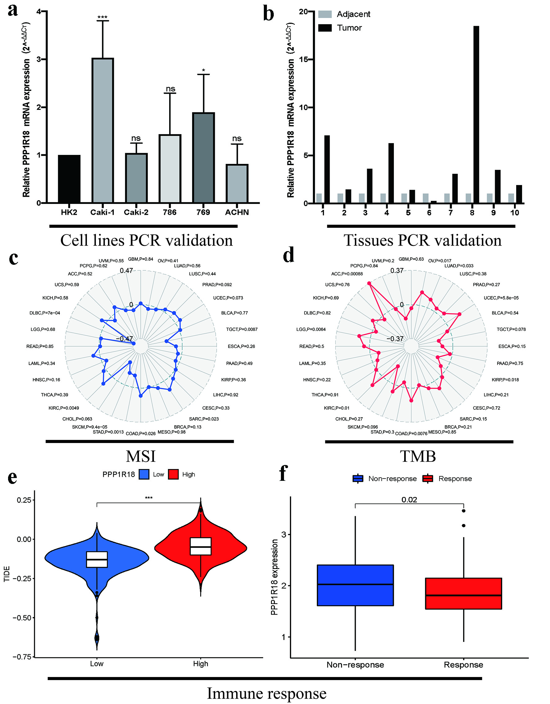 As for MSI and TMB, our results shed light on that PPP1R18 was remarkably linked to not only MSI (P = 0.0049, Fig. 2c), but also TMB (P = 0.01, Fig. 2d). To further predict the immune responses of PPP1R18 to immunotherapies, TIDE database and the IMvigor210 cohort were utilized, respectively. Based on above mentioned results, KIRC patients with low-PPP1R18 expression shall have a lower TIDE score, and be more sensitive to immunotherapies (both P < 0.05, Fig. 2e, f). Taken together, PPP1R18 could serve as a biomarker for immunotherapies and patients with low-PPP1R18 expression shall benefit most in KIRC.