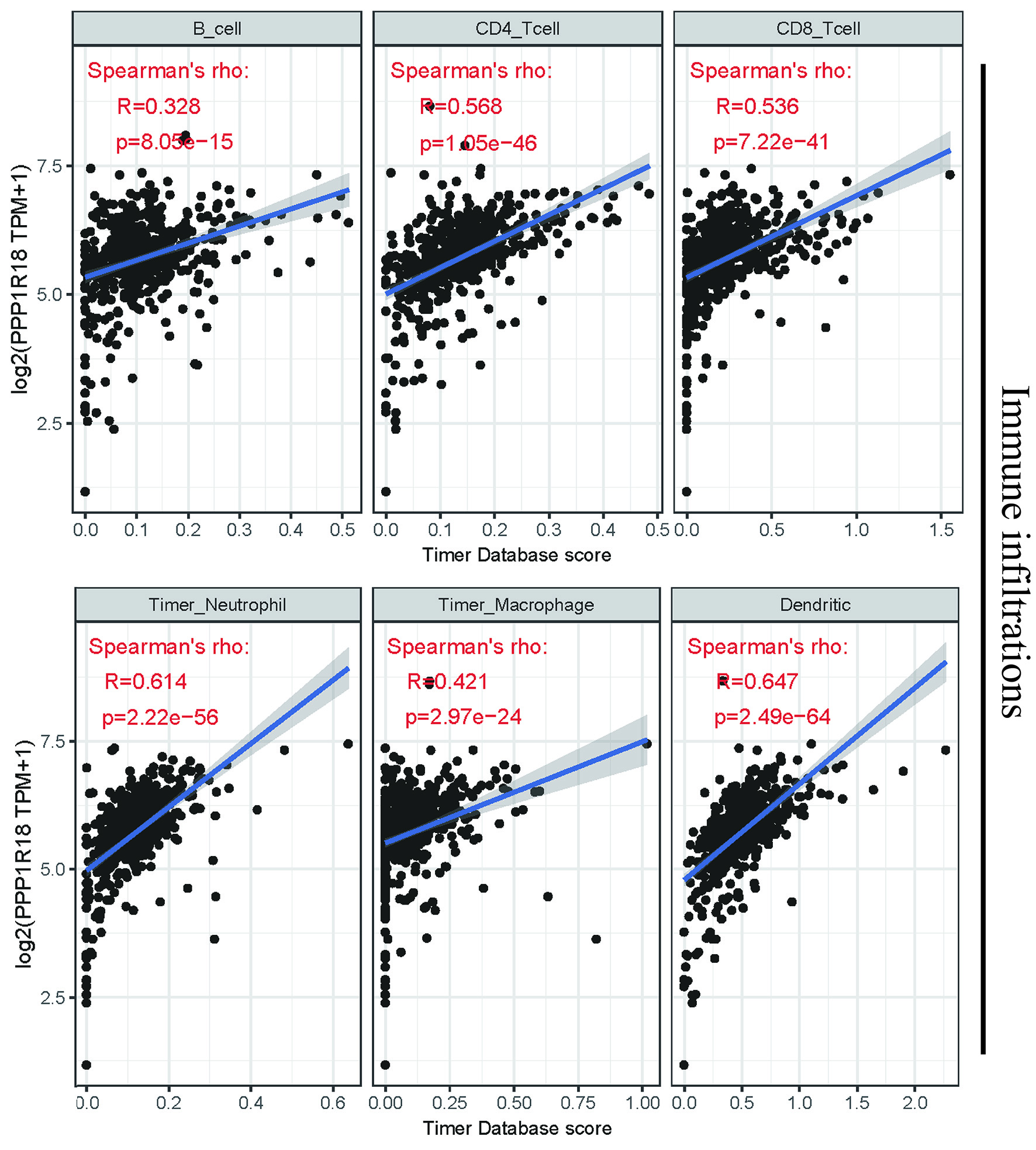 ![]() Click for large image | Figure 3. Relationships between PPP1R18 and immune infiltrations in KIRC. PPP1R18: protein phosphatase 1 regulatory subunit 18; KIRC: kidney renal clear cell carcinoma. |