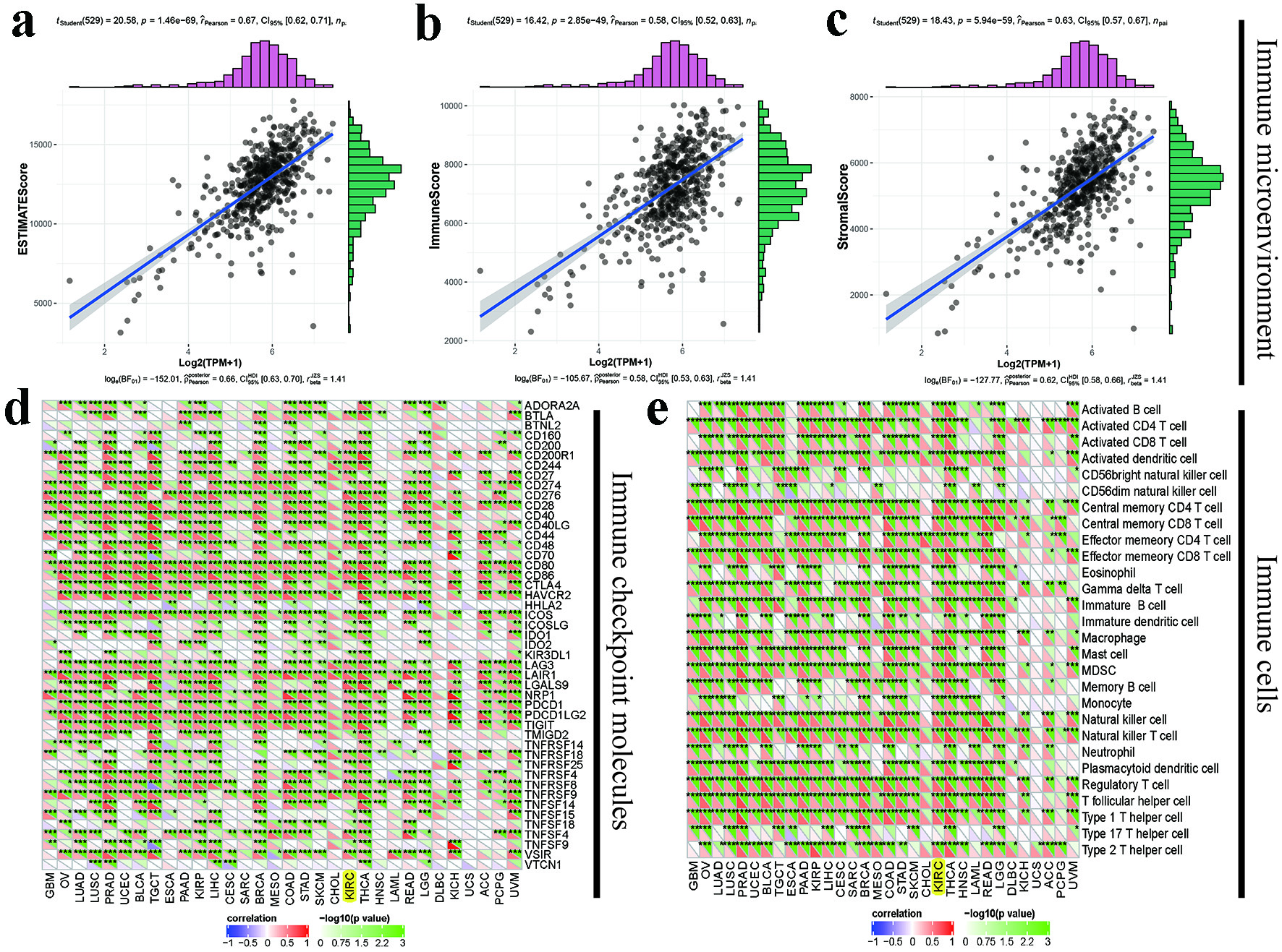 ![]() Click for large image | Figure 4. Immunological roles of PPP1R18 involved in KIRC: (a-c) relationships between PPP1R18 and tumor immune microenvironment in KIRC; (d) relationships between PPP1R18 and immune checkpoint molecules; (e) relationships between PPP1R18 and immune cells. *P < 0.05; **P < 0.01; ***P < 0.001. PPP1R18: protein phosphatase 1 regulatory subunit 18; KIRC: kidney renal clear cell carcinoma. |