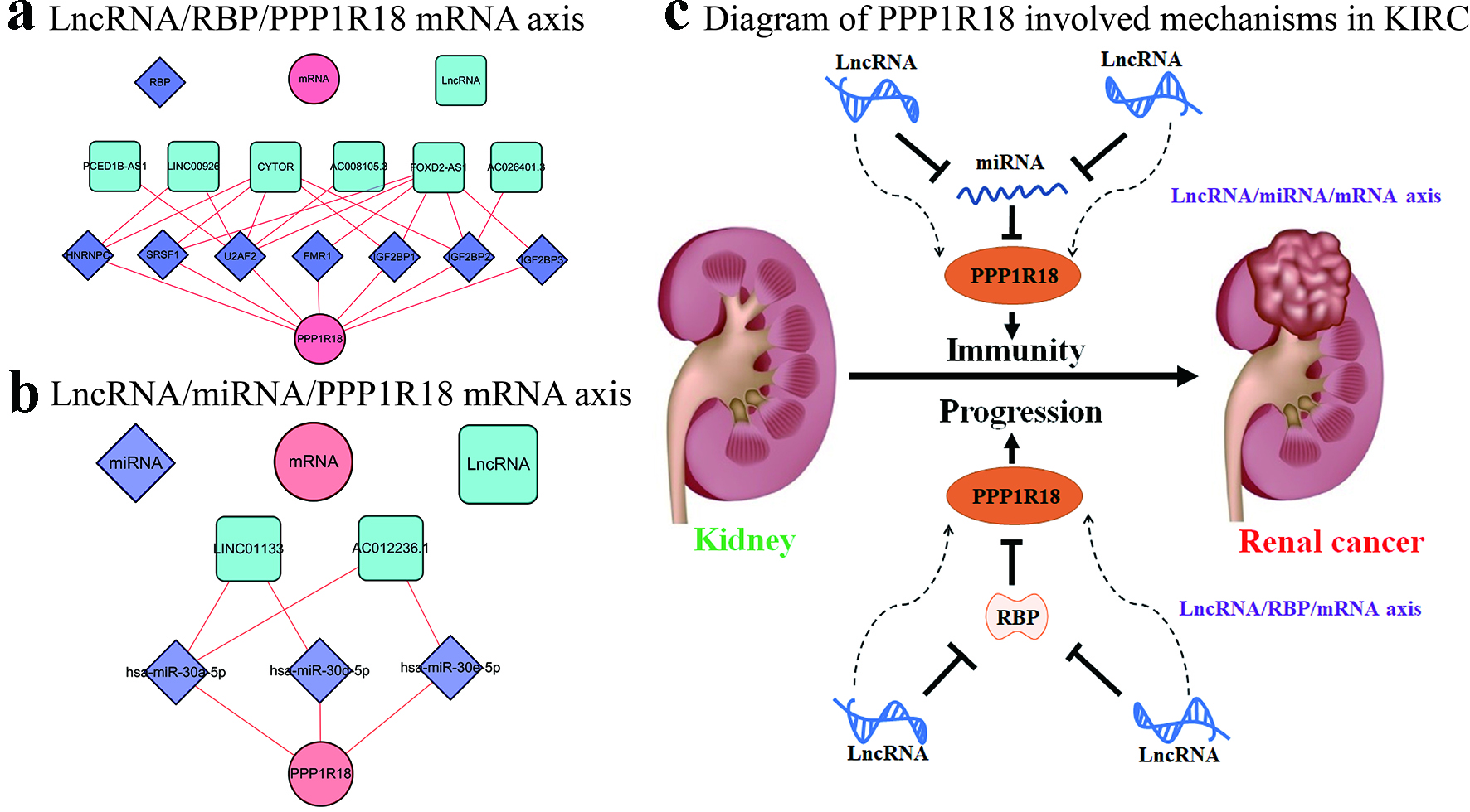 ![]() Click for large image | Figure 5. Potential mechanisms of PPP1R18 involved in KIRC: (a) LncRNA/RBP/PPP1R18 mRNA networks in KIRC; (b) LncRNA/miRNA/PPP1R18 mRNA networks in KIRC; (c) diagram of PPP1R18 involved mechanisms in KIRC. PPP1R18: protein phosphatase 1 regulatory subunit 18; KIRC: kidney renal clear cell carcinoma; RBP: RNA-binding protein. |