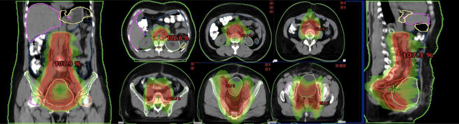 The dosimetric comparison showed that APLN significantly increased the mean planning target volume (PTV) dose by 15.08 ± 0.43 Gy (50.3%) compared to WART. It significant decrease the OAR dose: 25.37 ± 3.63 Gy for liver, 24.71 ± 3.91 Gy for spleen, 8.77 ± 5.03 Gy for the right kidney, 8.68 ± 5.89 Gy for the left kidney, 8.14 ± 1.51 Gy for the small intestine, 24.42 ± 5.72 Gy for the stomach, and 3.05 ± 2.00 Gy for the spine cord, meanwhile it increased the OAR dose comparing with WART: 6.32 ± 2.61 Gy for the right femoral, 7.26 ± 1.44 Gy for the left femoral, 5.70 ± 4.24 Gy for bladder, 14.04 ± 4.01 Gy for rectum, and 4.93 ± 2.90 Gy for bone marrow (Tables 5 and 6).