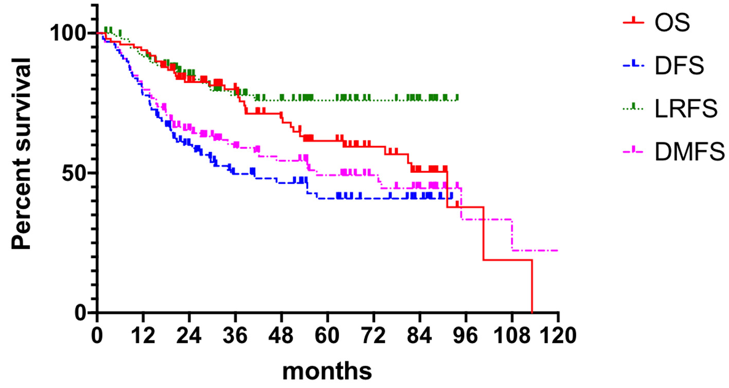 ![]() Click for large image | Figure 2. Clinical outcomes. OS: overall survival; DFS: disease-free survival; LRFS: local recurrence free survival; DMFS: distant metastasis free survival. |