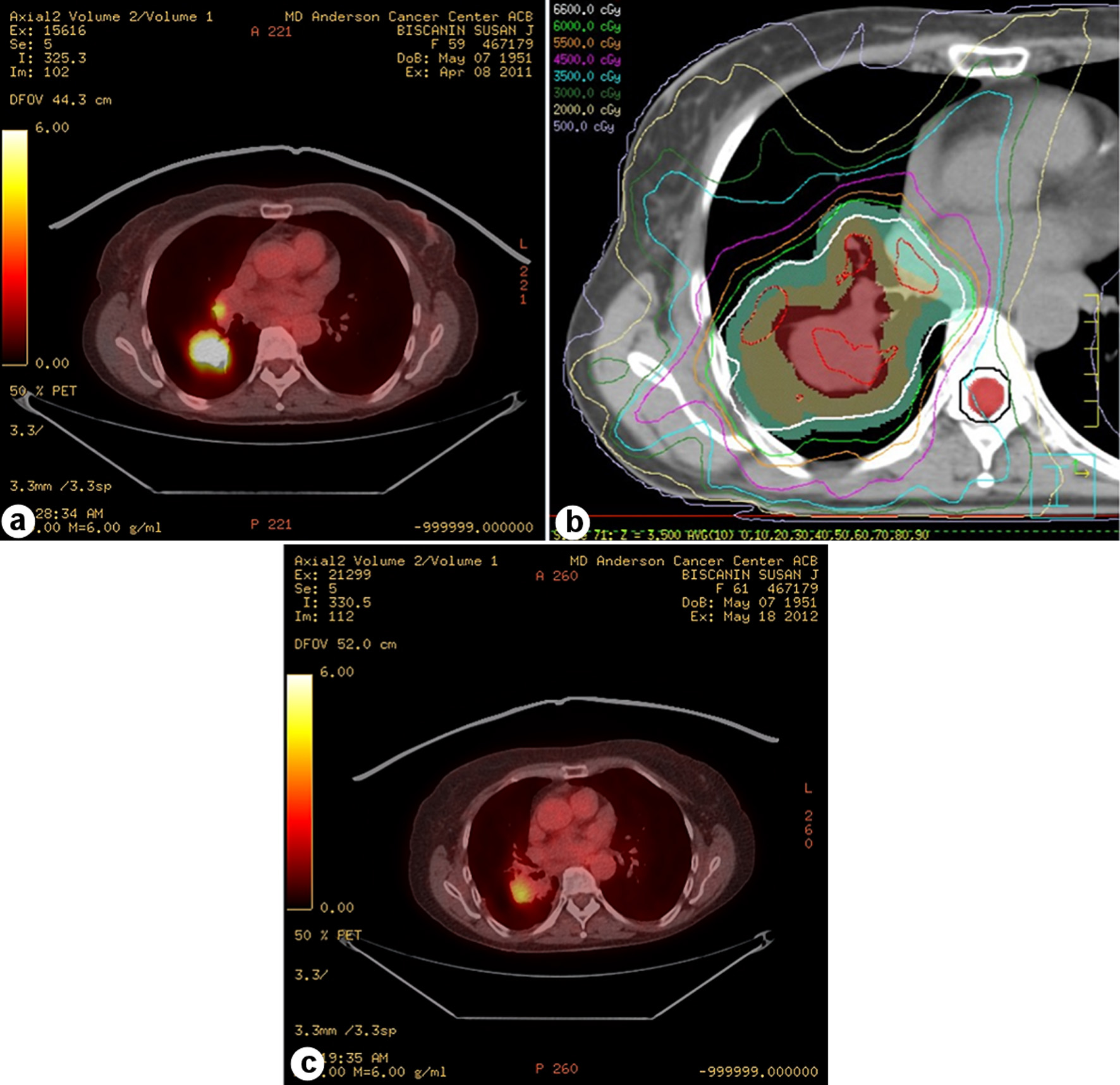 Follow-up visits were conducted at least once before radiation therapy and weekly during treatment; each visit included interval history and physical examinations. Post-treatment follow-up visits were scheduled during the first 1 - 3 months after completing radiation therapy, every 3 - 4 months thereafter for the first 2 - 3 years, and then twice a year until 5 years after completing radiation therapy. Chest CT and PET were performed every 3 - 6 months after radiation therapy.