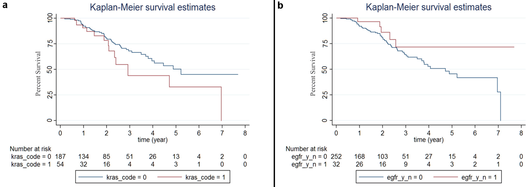 ![]() Click for large image | Figure 2. Kaplan-Meier plots of local progression-free survival (LPFS) according to EGFR and KRAS mutation status. (a) LPFS curves for patients with KRAS mutation (red line; krasm = 1), KRAS wild-type (WT; blue line (krasm = 0), P = 0.129). (b) LPFS curves for patients with EGFR mutation (red line; egfr = 1), EGFR WT (blue line; egfr = 0) P = 0.099. EGFR: epidermal growth factor receptor; KRAS: V-Ki-ras2 Kirsten rat sarcoma viral oncogene homolog. |