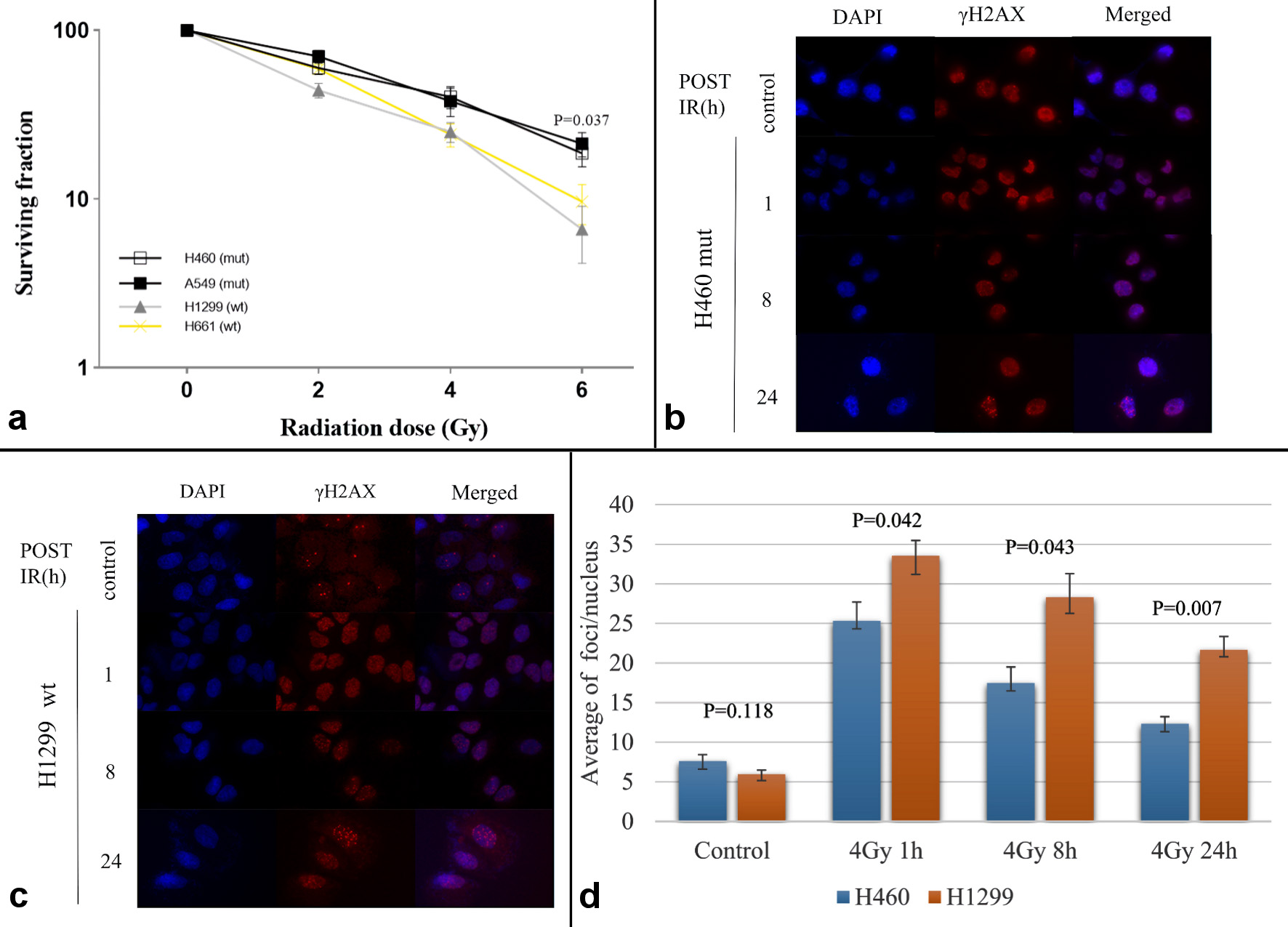 We hypothesized that NSCLC cell lines with KRAS mutation would be more resistant to radiation than cell lines with wild-type KRAS. To test this hypothesis, we performed clonogenic assays with two cell lines harboring KRAS mutations (H460 and A549) and two cell lines with wild-type KRAS (H1299 and H661). In support of our previous results in patients, we found that cell lines with KRAS mutations were more resistant to radiation than wild-type cells (Fig. 3a). In contrast, H1299 (KRAS wild-type (wt)) and H460 (KRAS mutation (mut)) were irradiated with ionizing radiation (4 Gy); immunofluorescence analyses were performed at the indicated time points. The number of γH2AX foci was then counted and quantified. Representative images of γH2AX foci in H460 (KRAS mut) and H1299 (KRAS WT) cells at each time point are shown in Figure 3b, c. The average (± SD) number of γH2AX foci per cell of control was not different between H460 and H1299 cell lines (7.61 ± 1.42 vs. 5.97 ± 1.13, P = 0.118). γH2AX foci were significantly higher after radiation, and significantly different from that at baseline at 1 h (25.32 ± 4.11 vs. 33.54 ± 1.93, P = 0.042) and 8 h (17.47 ± 3.51 vs. 28.3 ± 6.64, P = 0.043), and significantly higher at 24 h (12.33 ± 1.52 vs. 21.67 ± 3.78, P = 0.007) for the H1299 cell line (Fig. 3d).