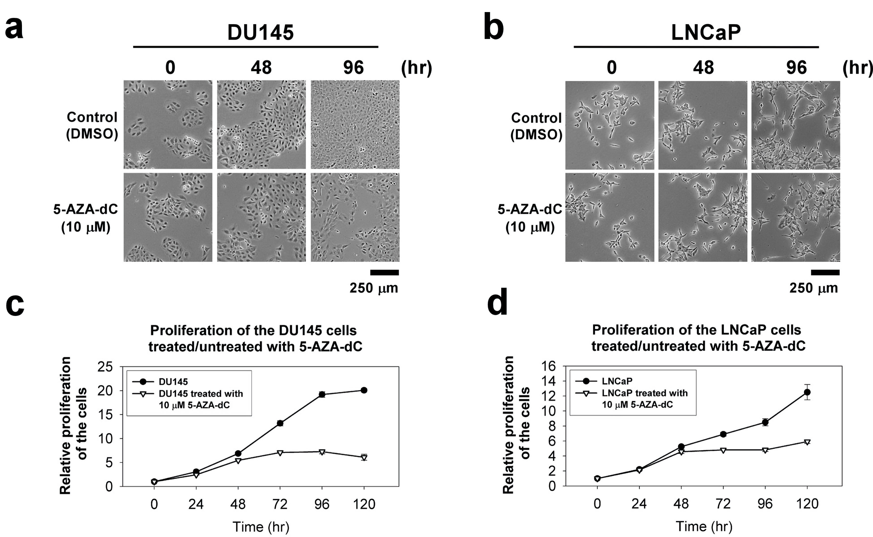 The cellular morphology of DU145 and LNCaP cells with or without 10 µM 5-AZA-dC treatment in indicated time points, 0 h, 48 h and 96 h, did not show any significant difference (Fig. 4a, b). To investigate the effects of 5-AZA-dC to the ability of proliferation in prostate cancer cells, the proliferation of the DU145 and LNCaP cells treated or untreated with 10 µM 5-AZA-dC for 120 h was examined by the CCK-8 assay. The results showed that the 5-AZA treatment inhibit the cell viability of DU145 and LNCaP cells significantly (Fig. 4c, d).