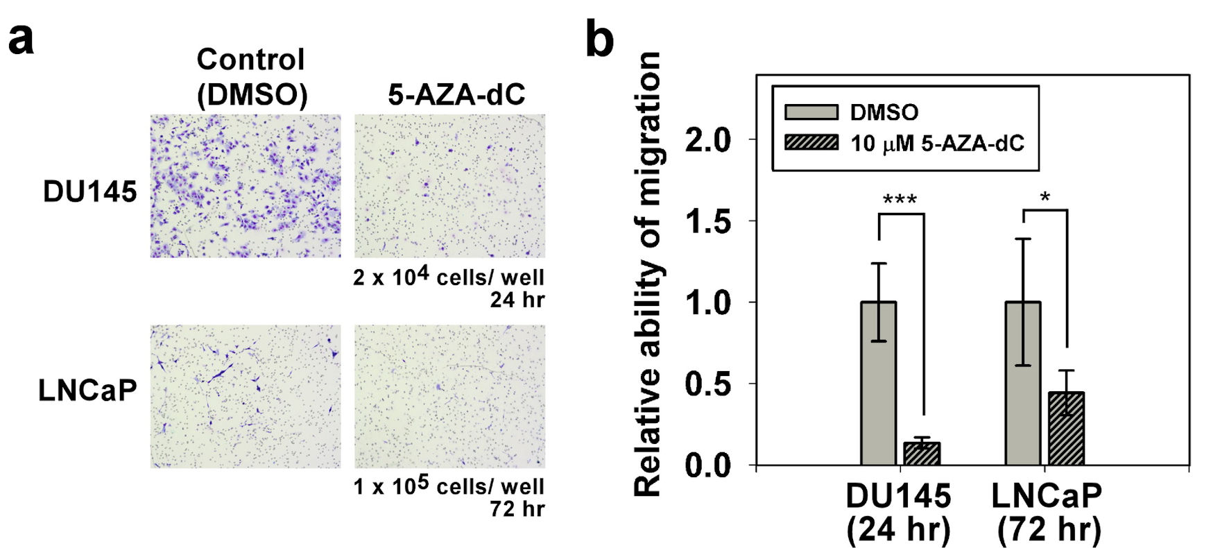 The influence of 5-AZA-dC on the migration of DU145 and LNCaP cells was investigated by using a Transwell® system. Compared with the control DU145 cells, the cell migration of the DU145 cells with 5-AZA-dC treatment was significantly decreased (Fig. 5a up). In addition, compared with the control LNCaP cells, the cell migration of the LNCaP cells with 5-AZA-dC treatment was only slightly decreased (Fig. 5a down). The cell migration of the DU145 or LNCaP cells with or without 5-AZA-dC treatment was summarized and analyzed statistically (Fig. 5b).